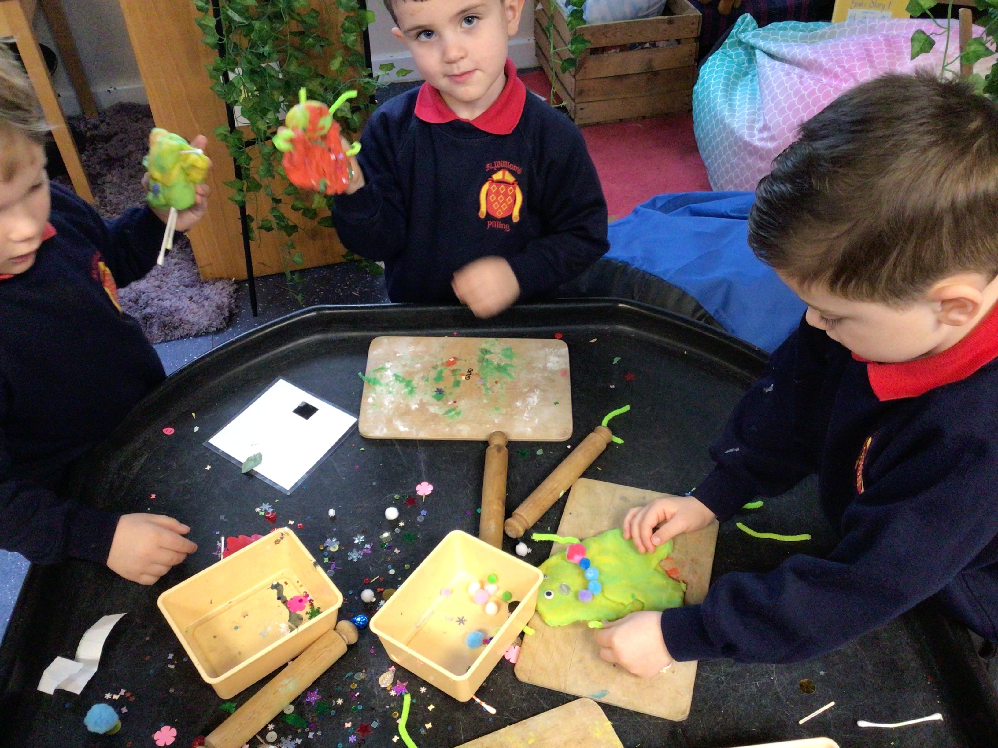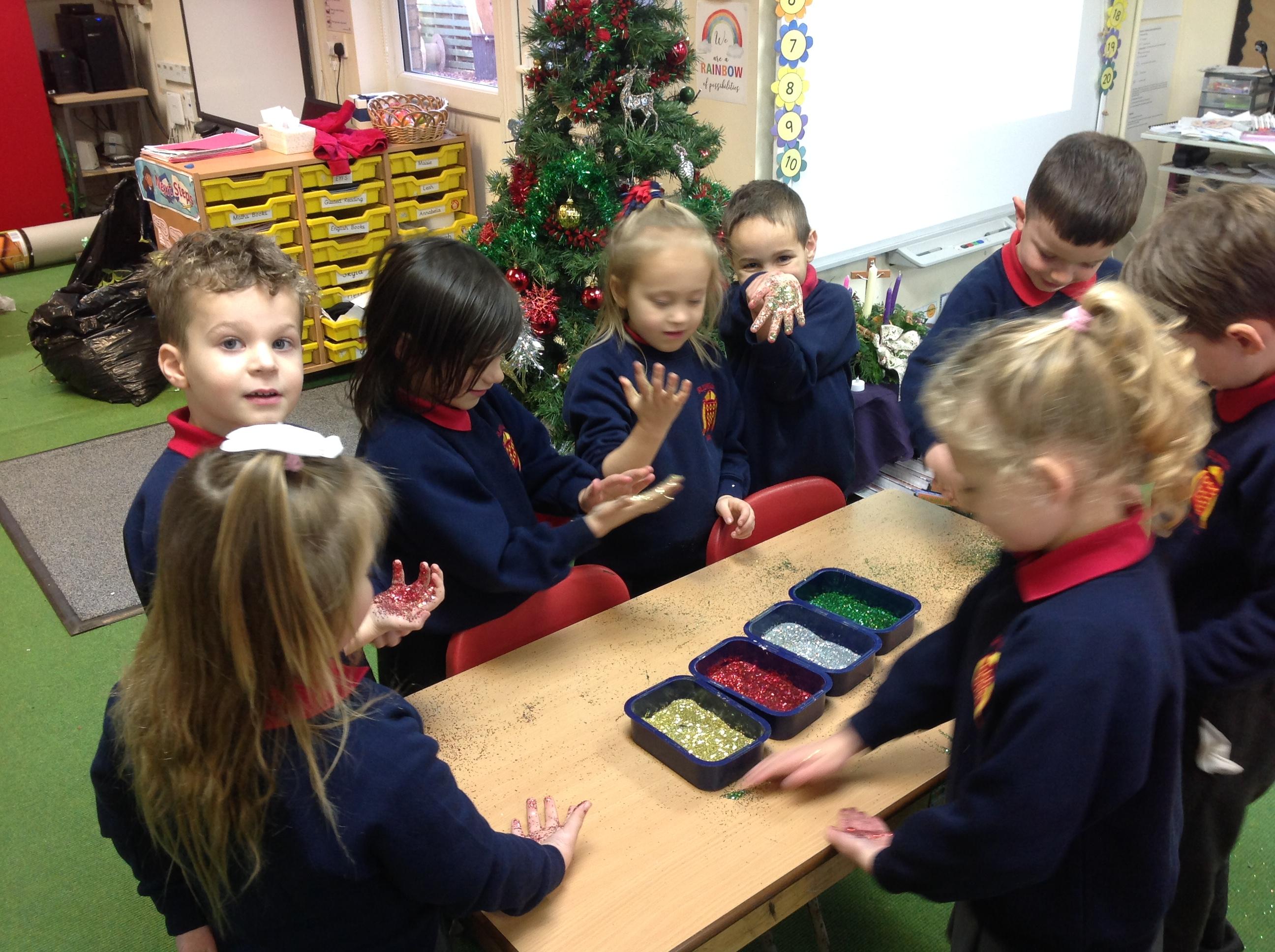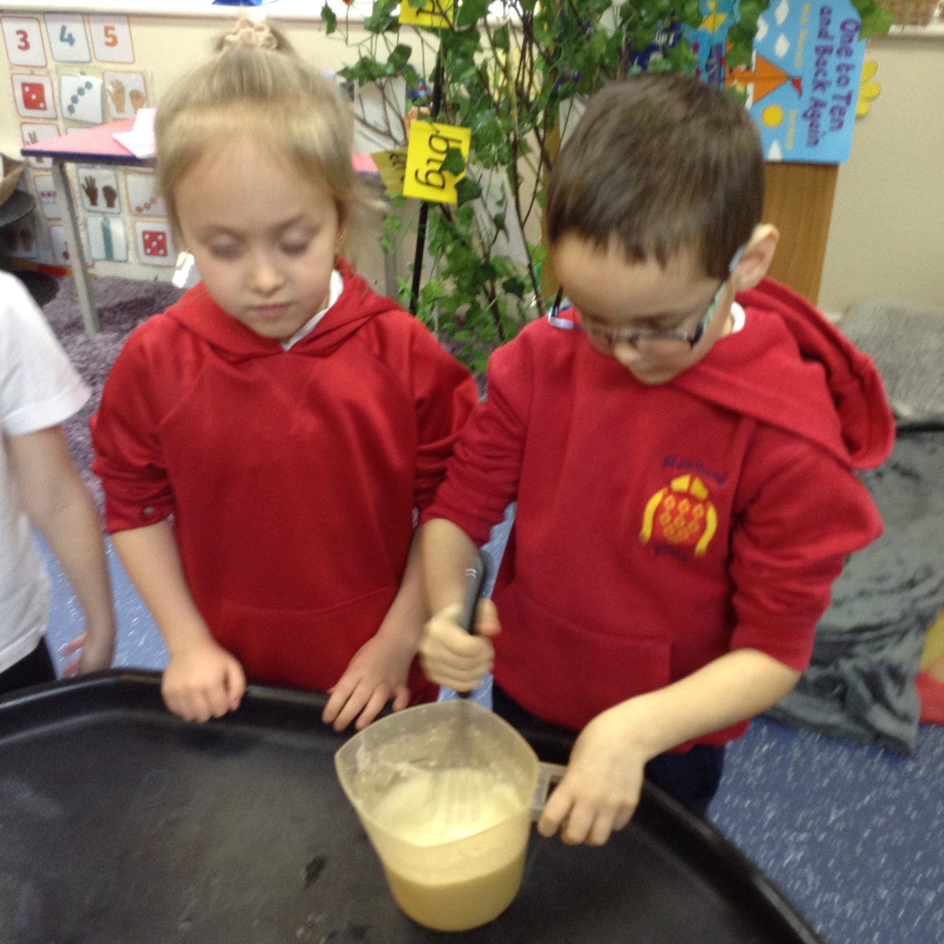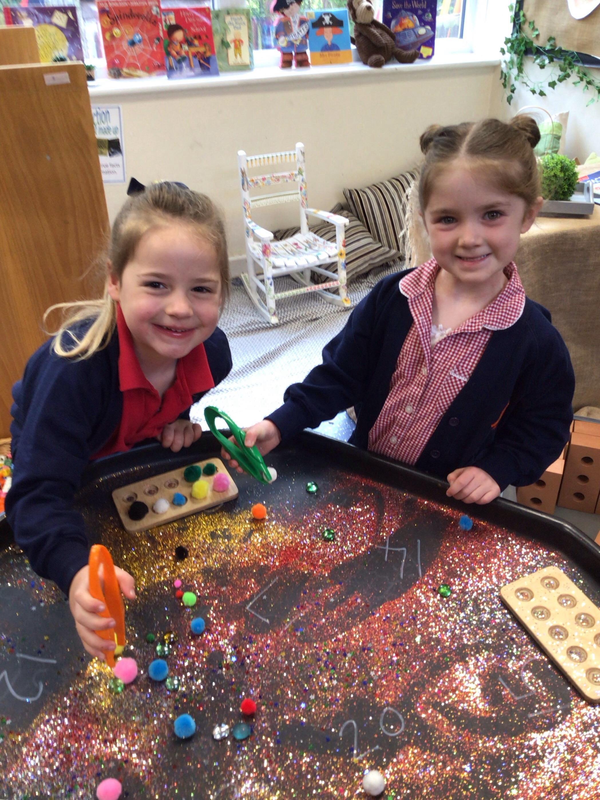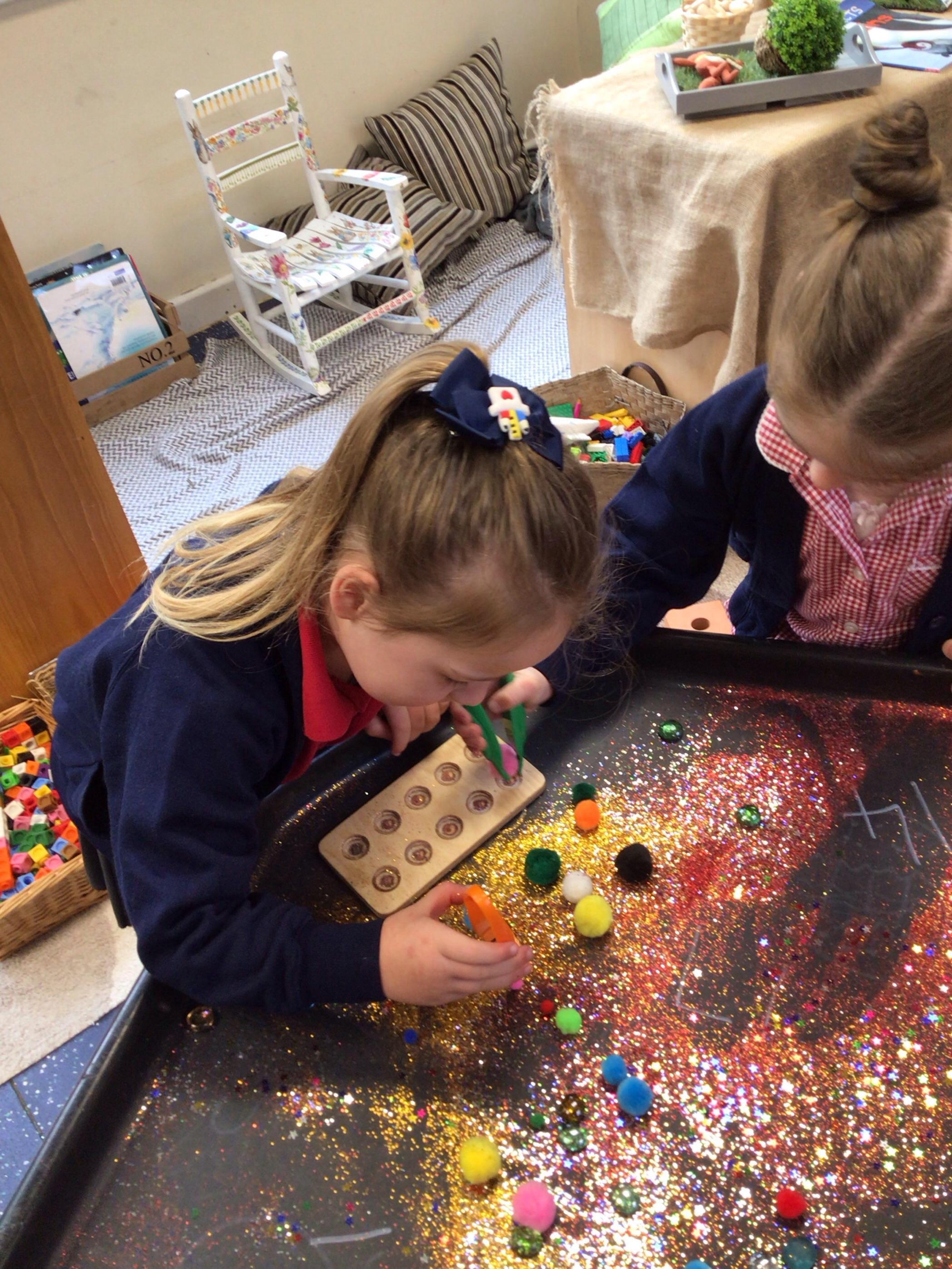 In maths, the children were great at using the Numicon to make teen numbers. The children also enjoyed exploring the maths glitter tray together and spending time in the continuous provision.