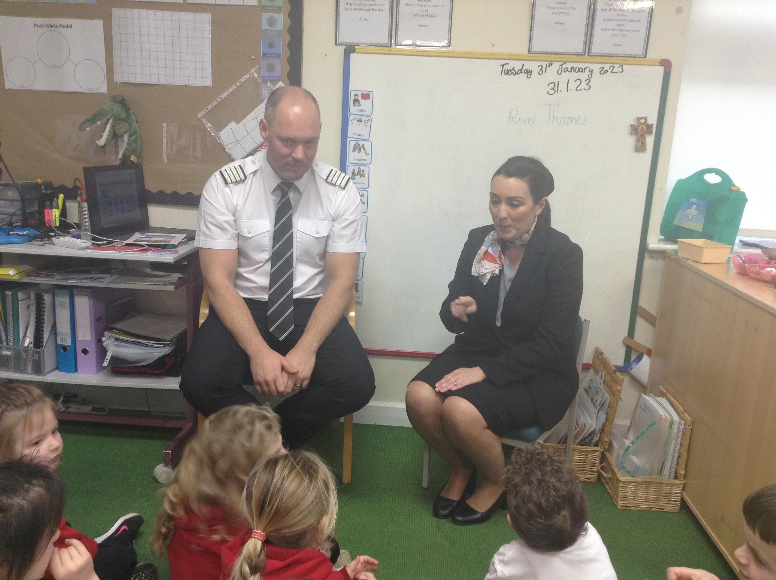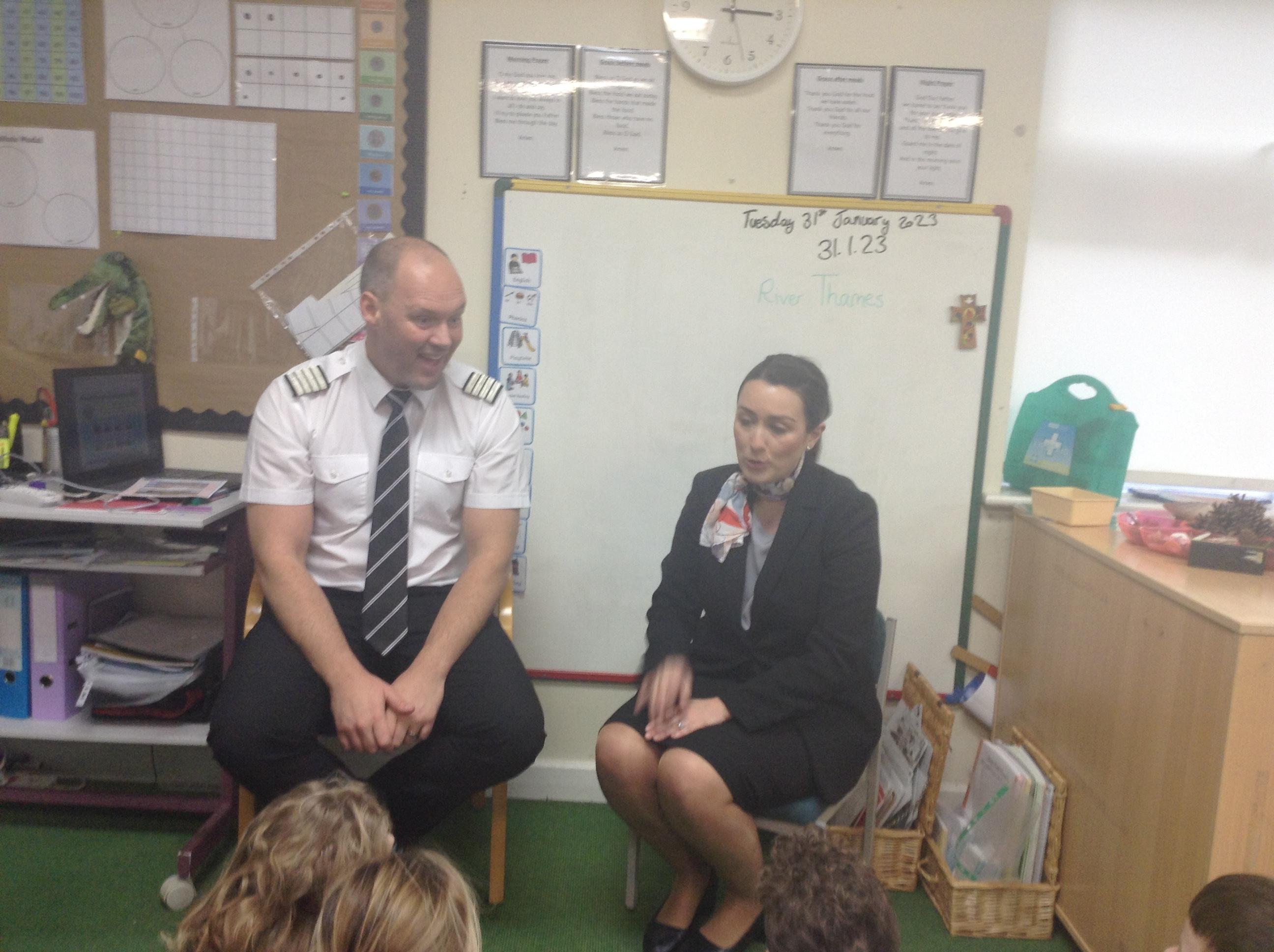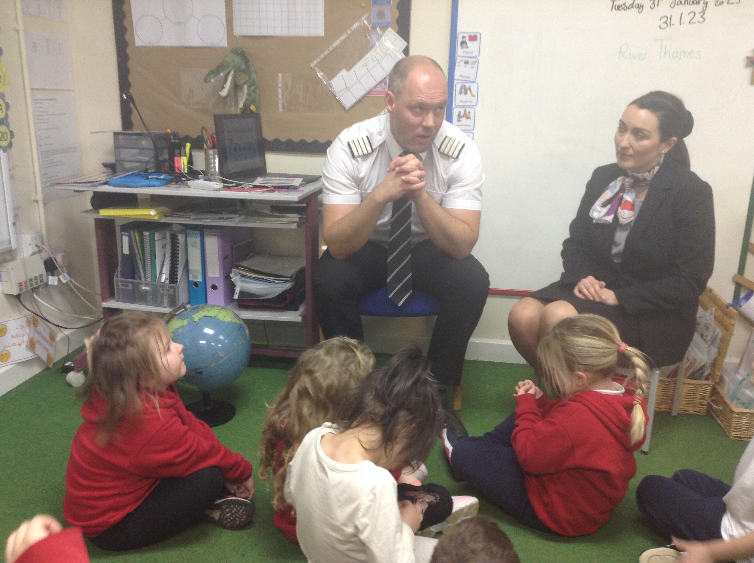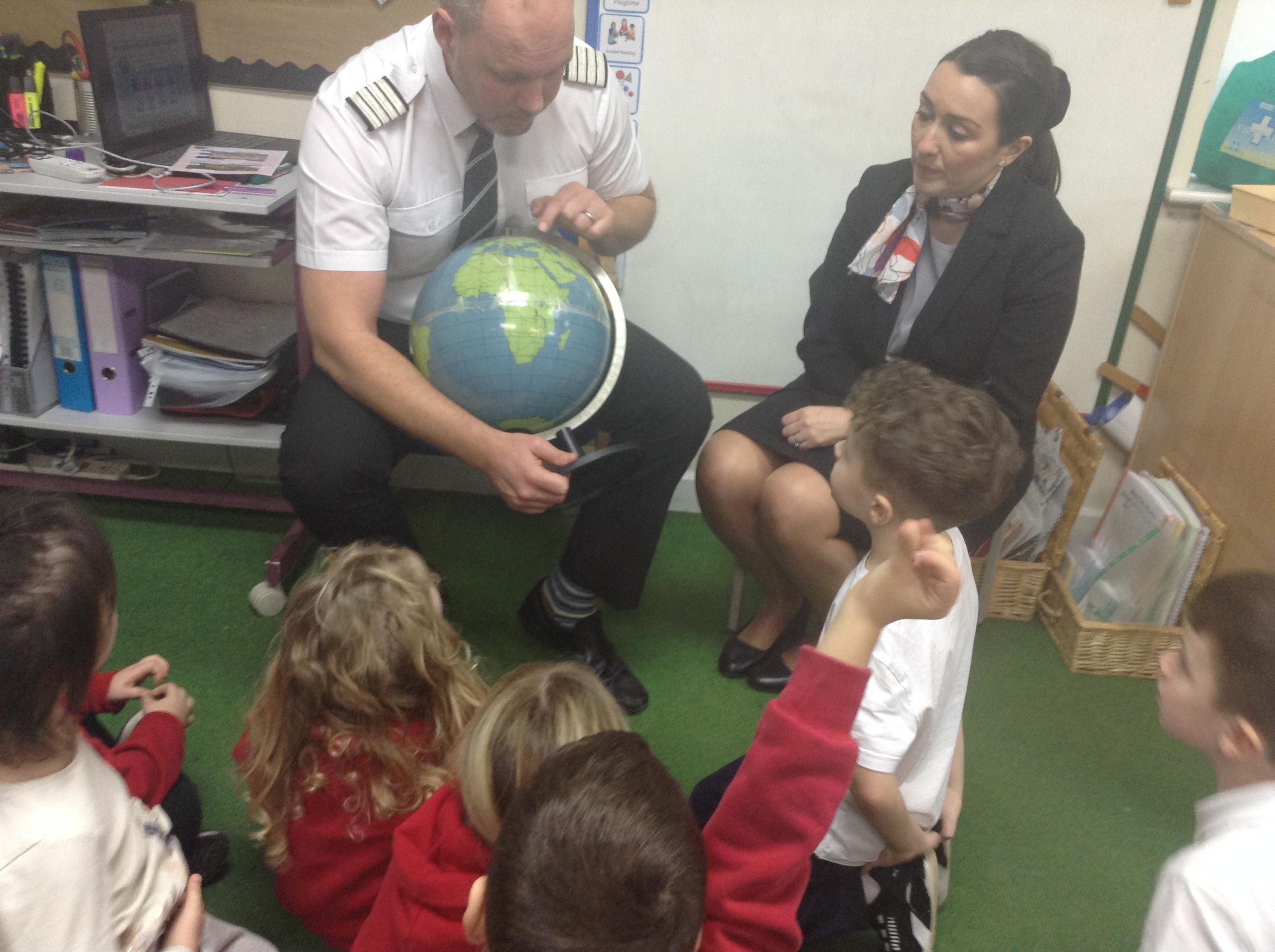 What an exciting day we have had in Class 1 today. The children were fortunate to have Mr and Mrs Lindsay come in to discuss their jobs as pilots and air hostess. They talked about places that they had visited, showed the children where about they are on the globe and discussed the climates.