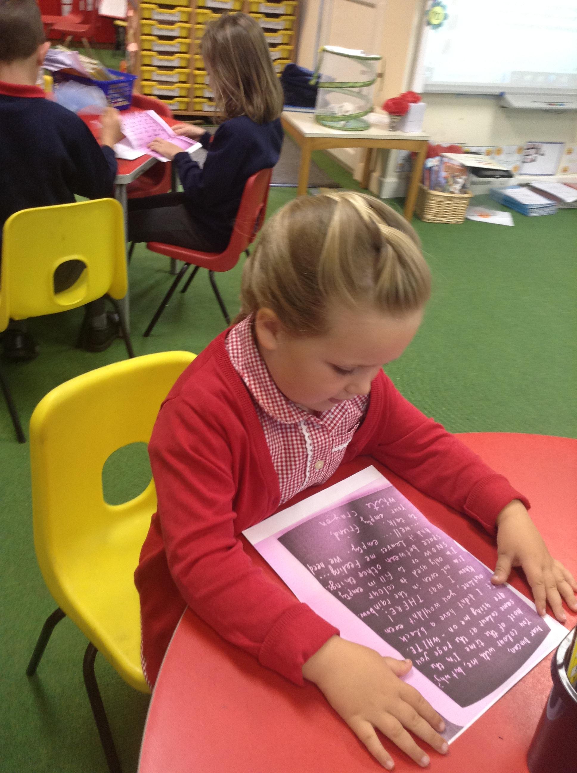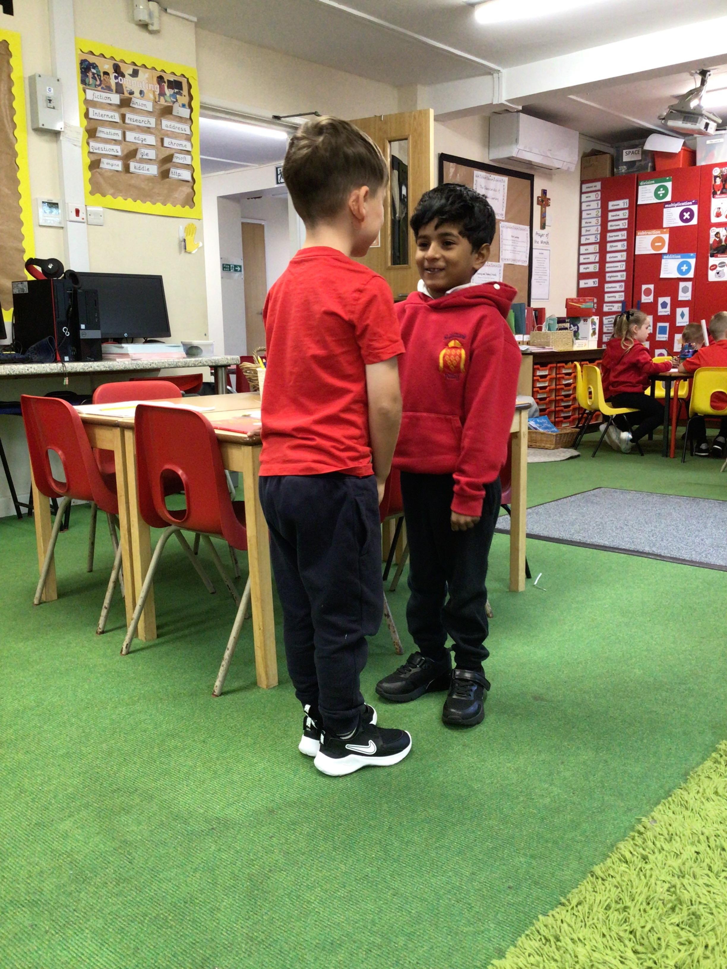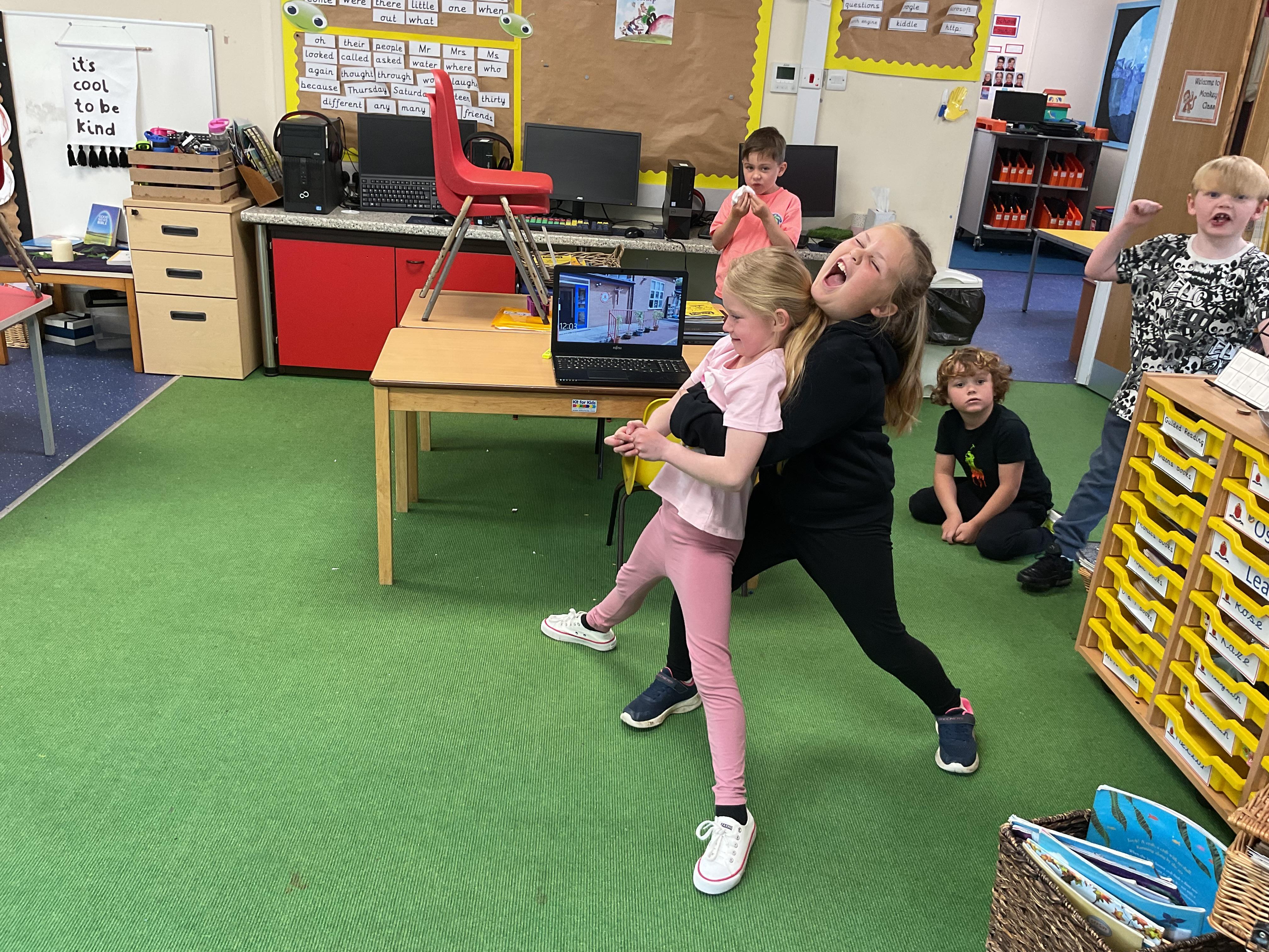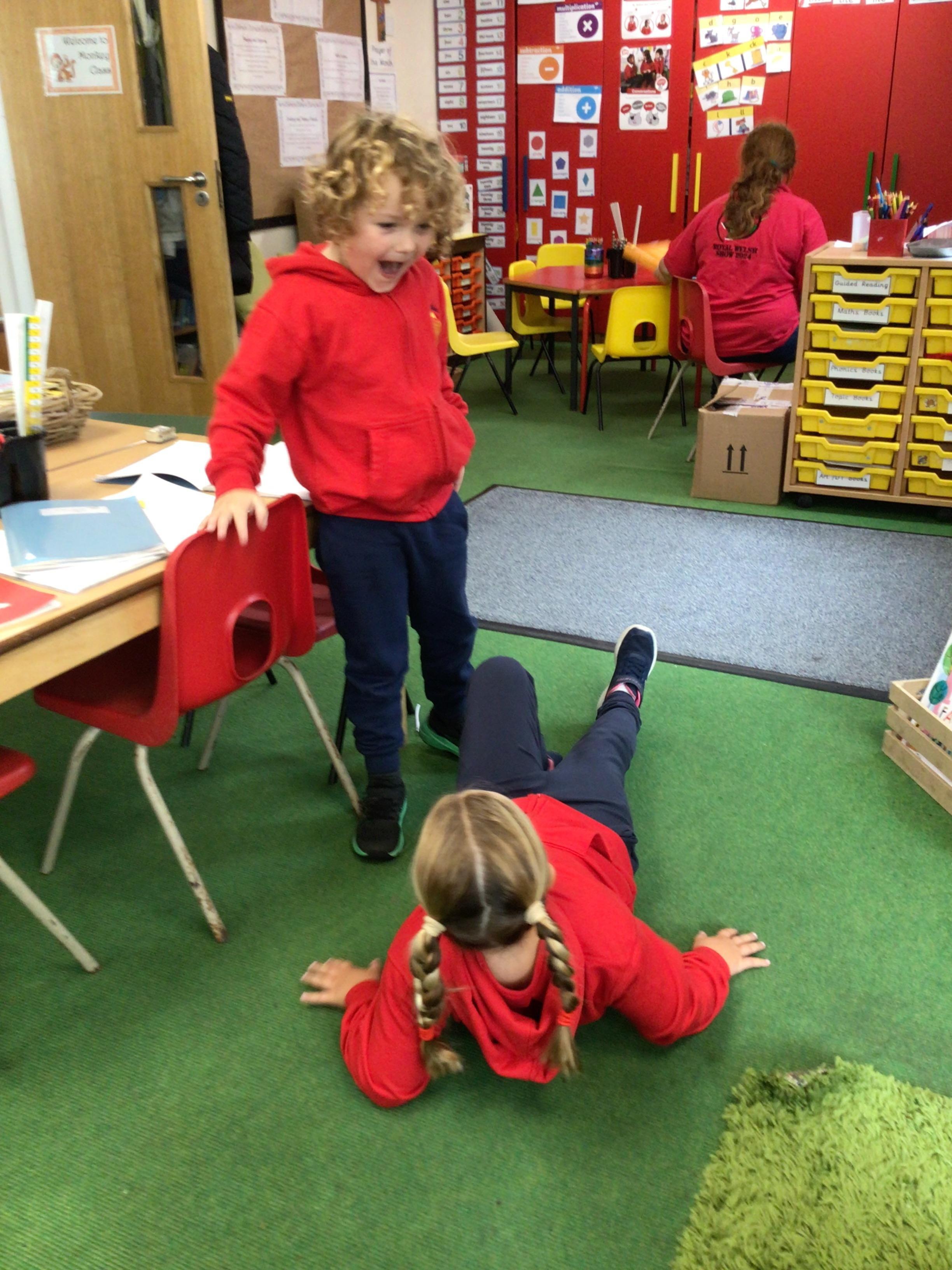 In English, we’re reading ‘The Perfect Pet’ by Fiona Roberton. This morning we acted out part of the story in pairs. The audience had to guess the characters from the story.