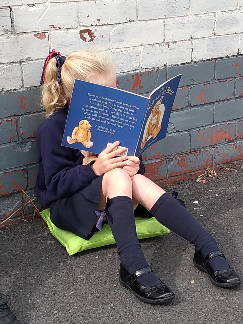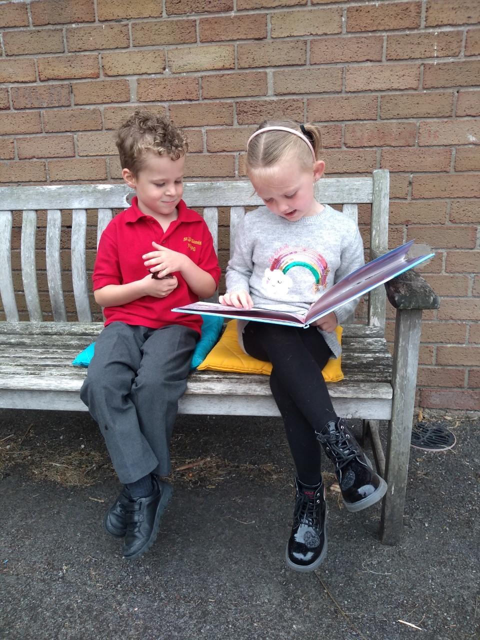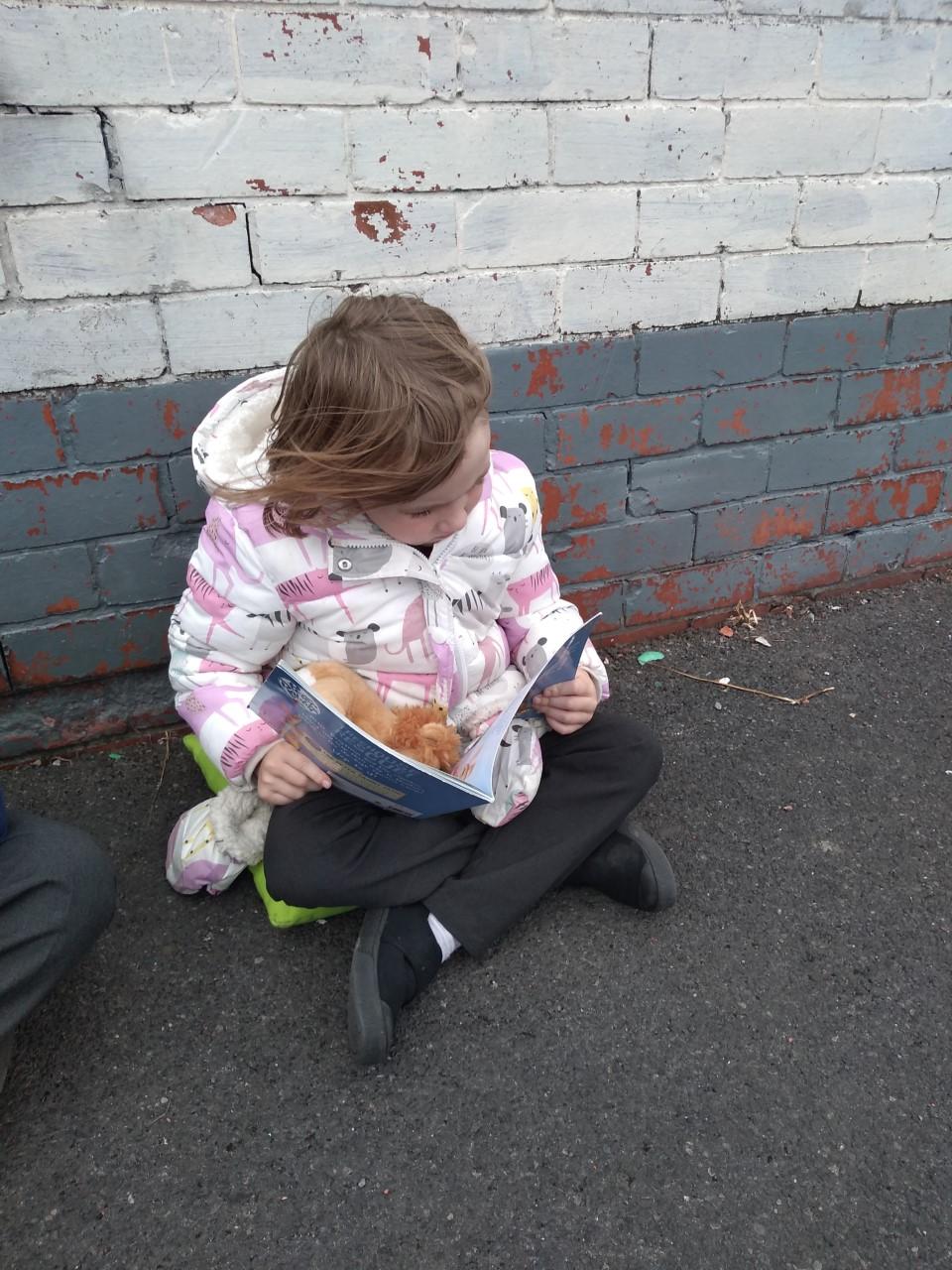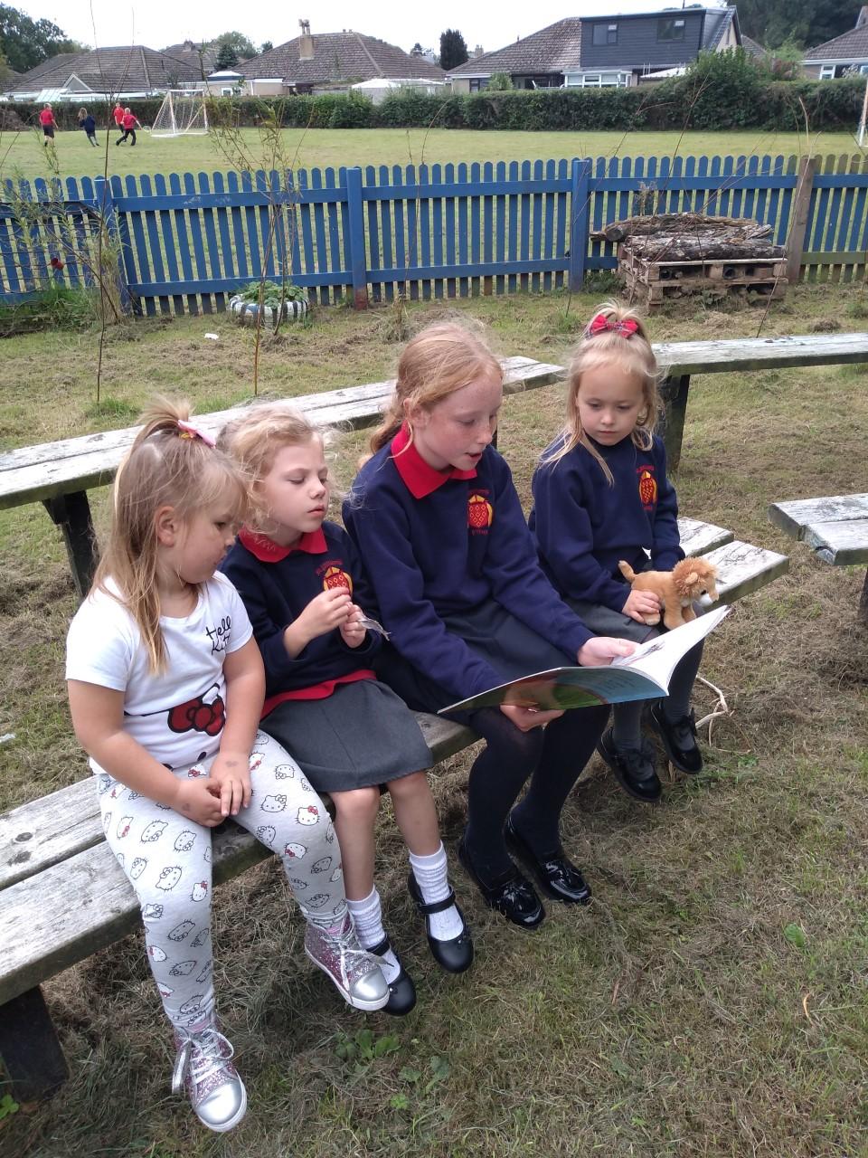 The library is set up outside in the playground, where children can borrow a book to share with a friend or read quietly by themselves. The older children, and members of staff, read stories to our younger children who are just starting out on their reading journey.