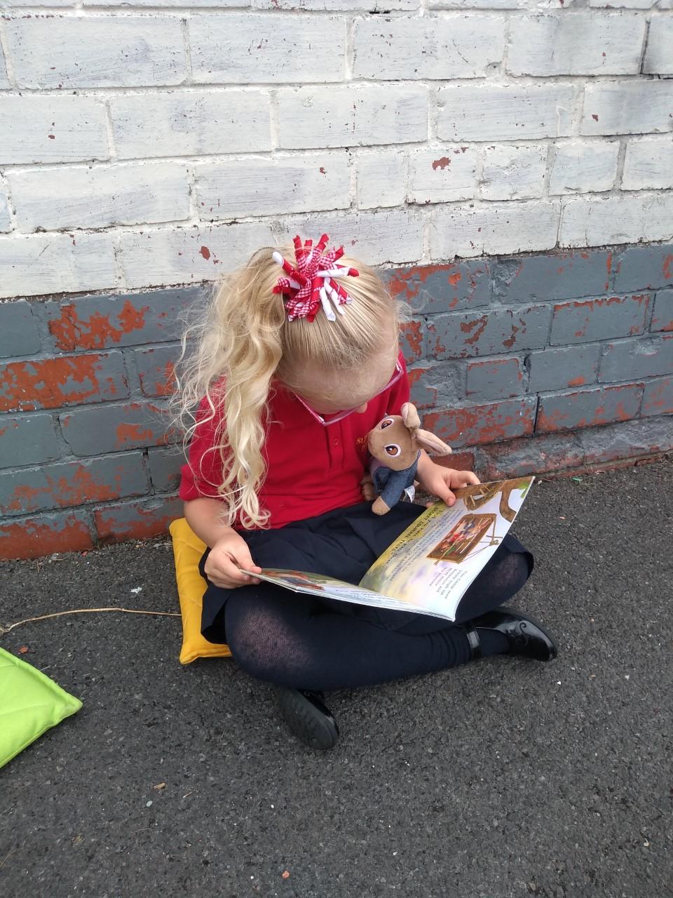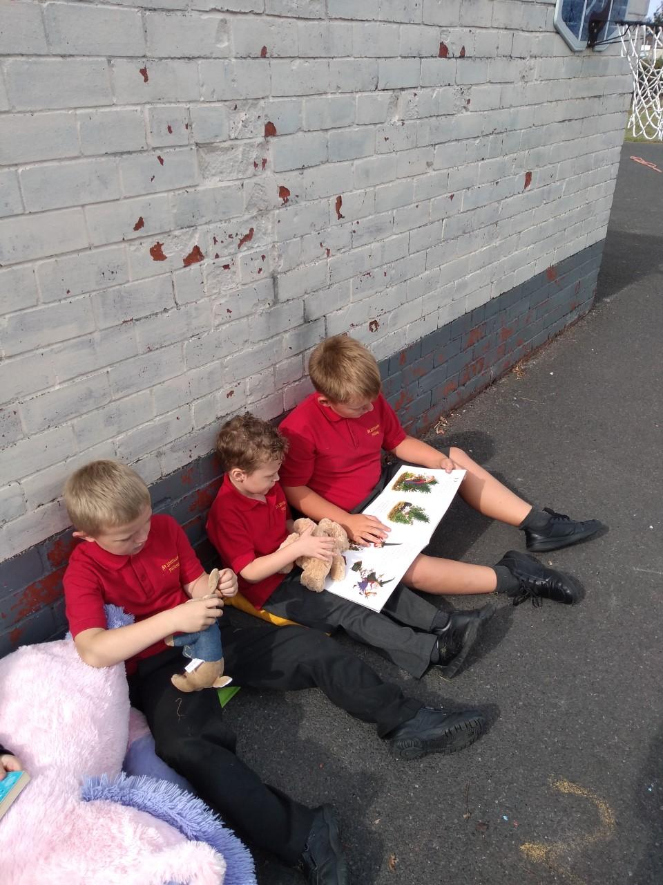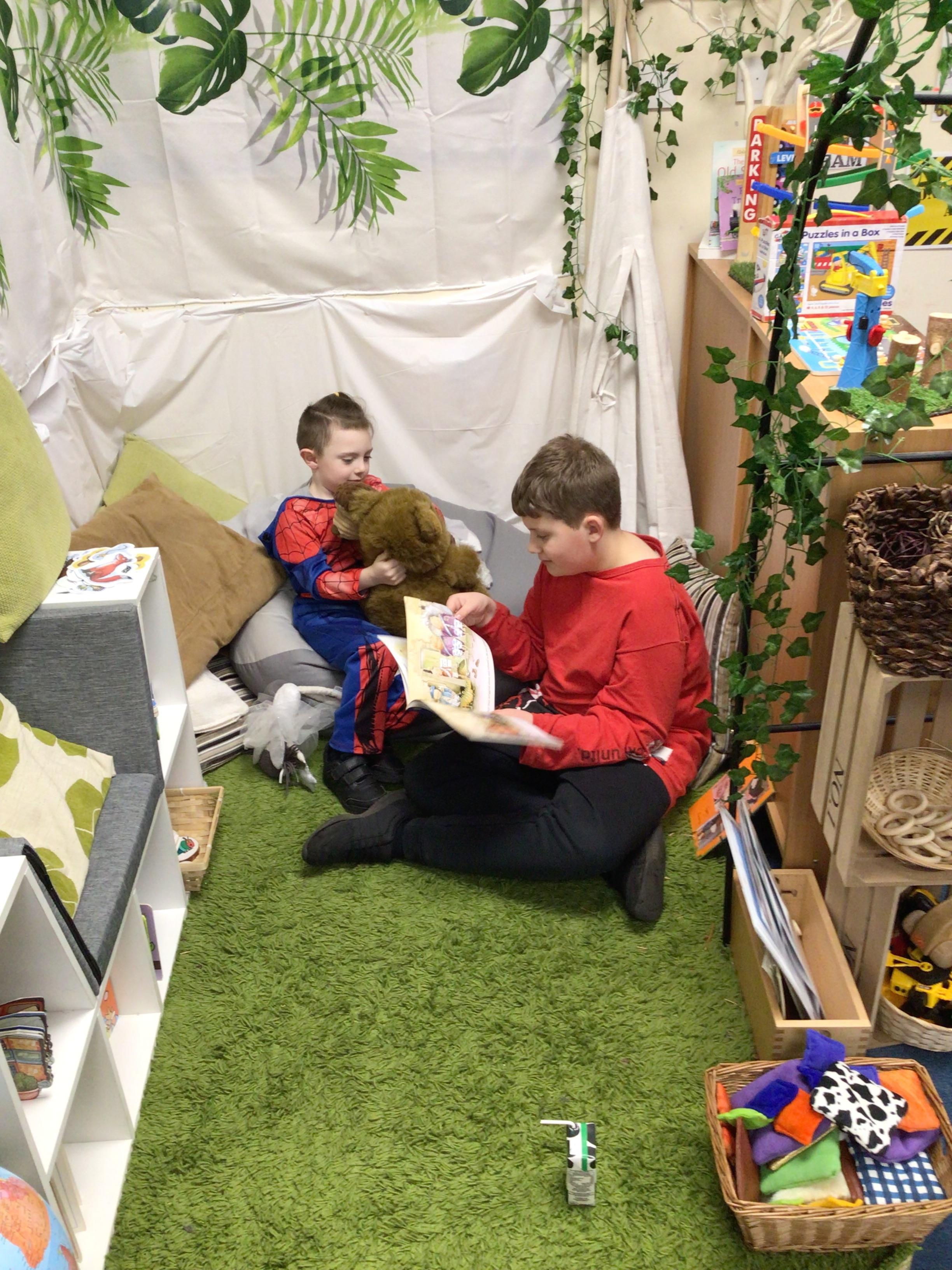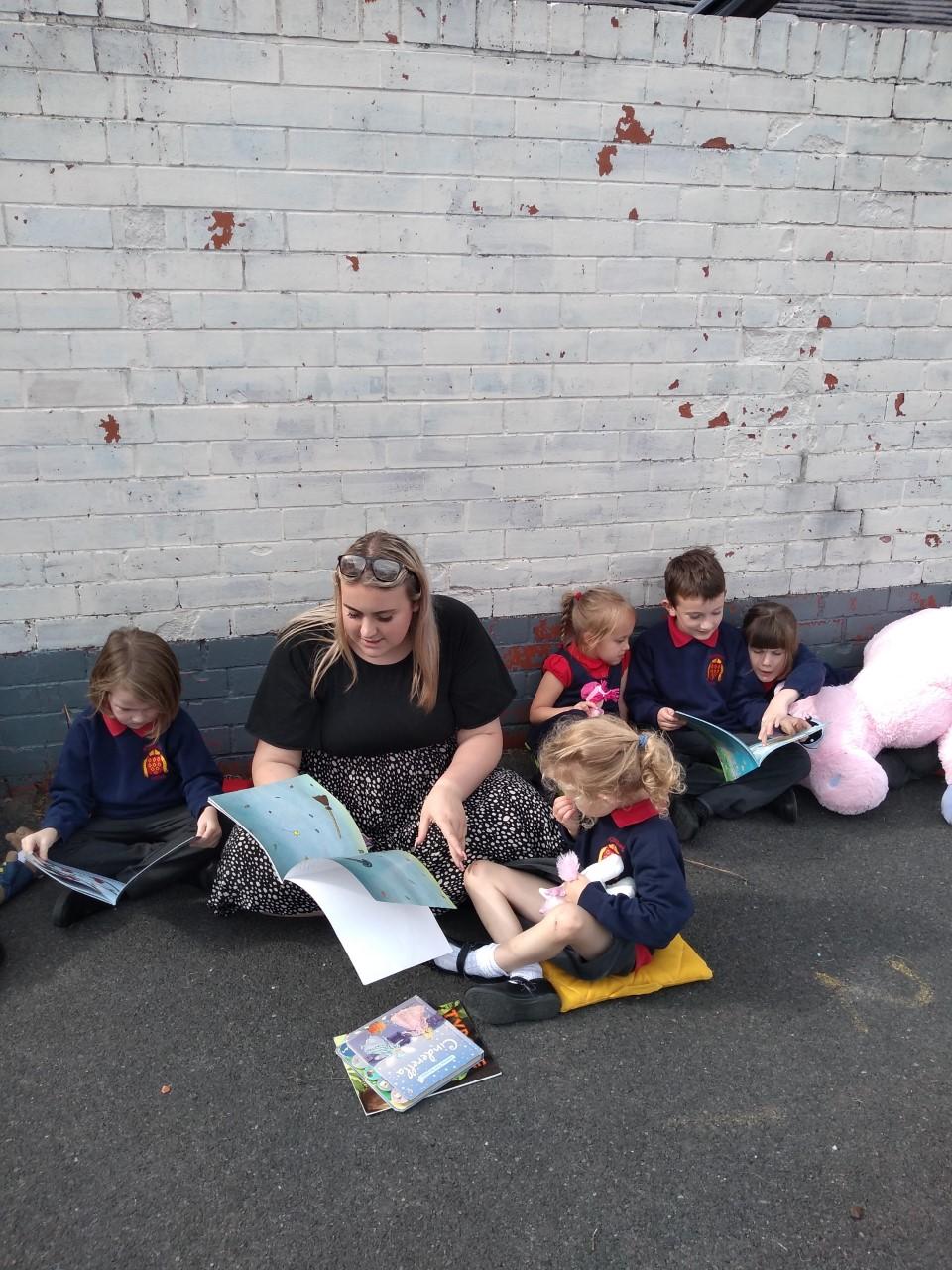 The library is set up outside in the playground, where children can borrow a book to share with a friend or read quietly by themselves. The older children, and members of staff, read stories to our younger children who are just starting out on their reading journey.