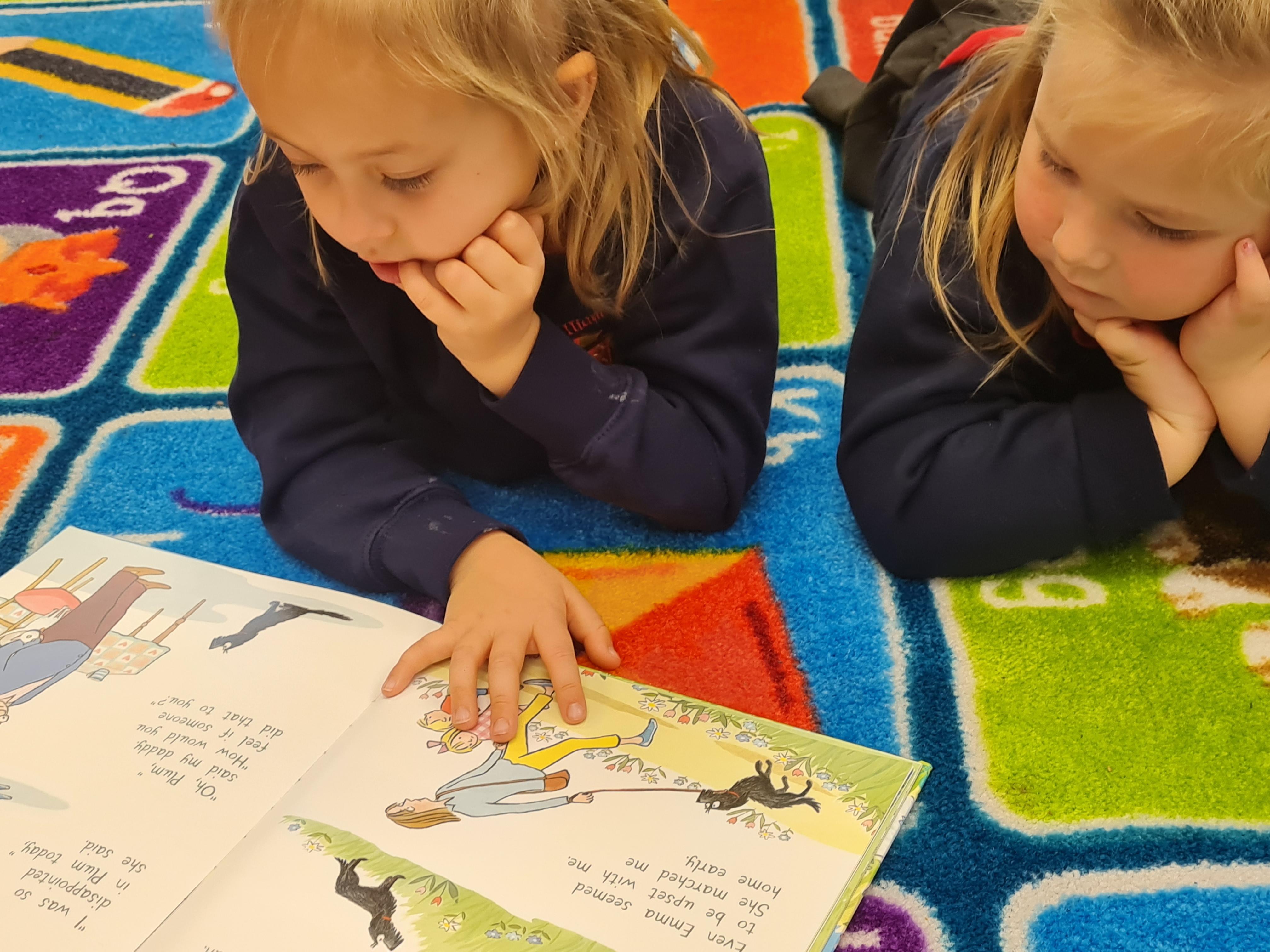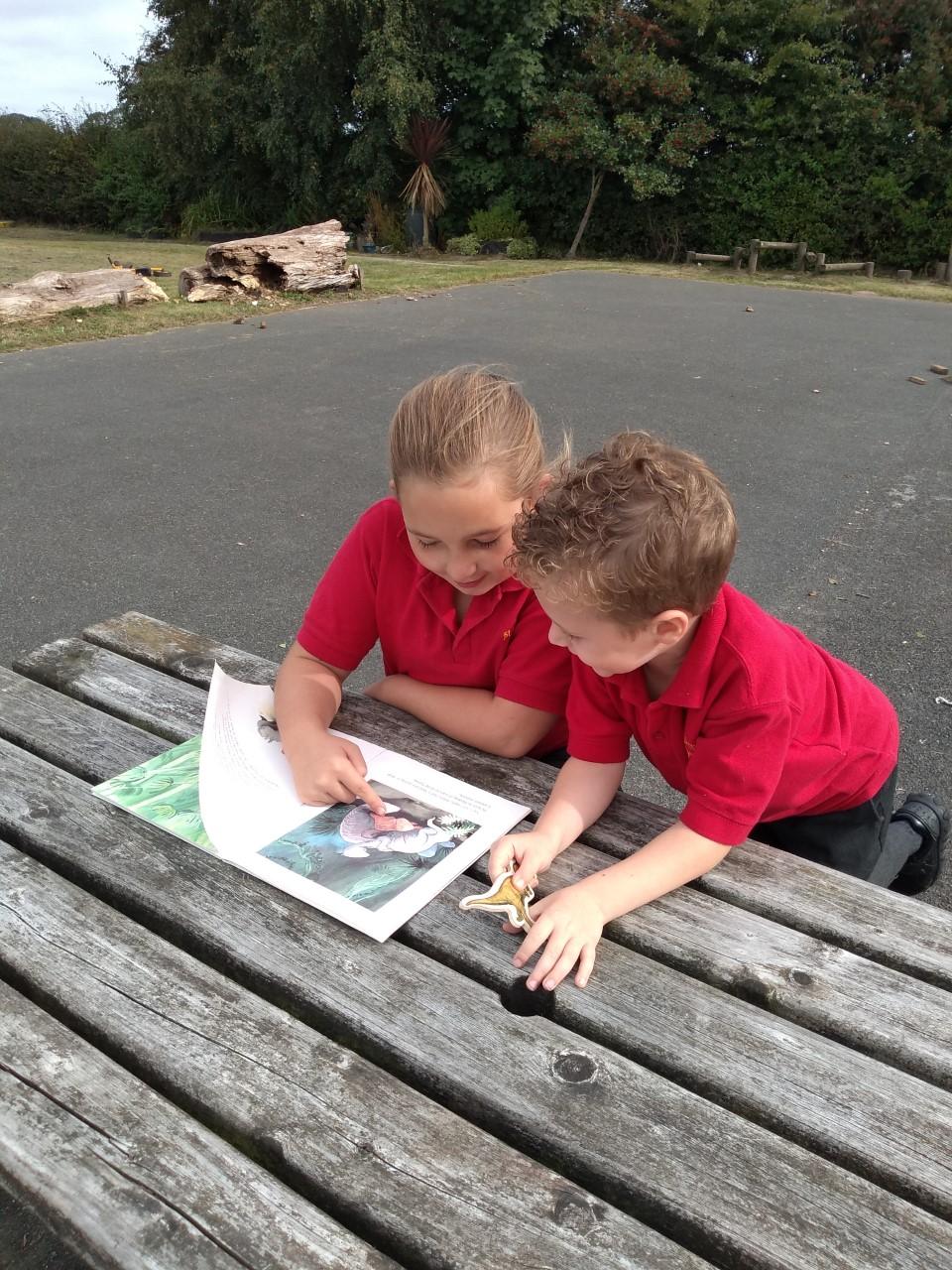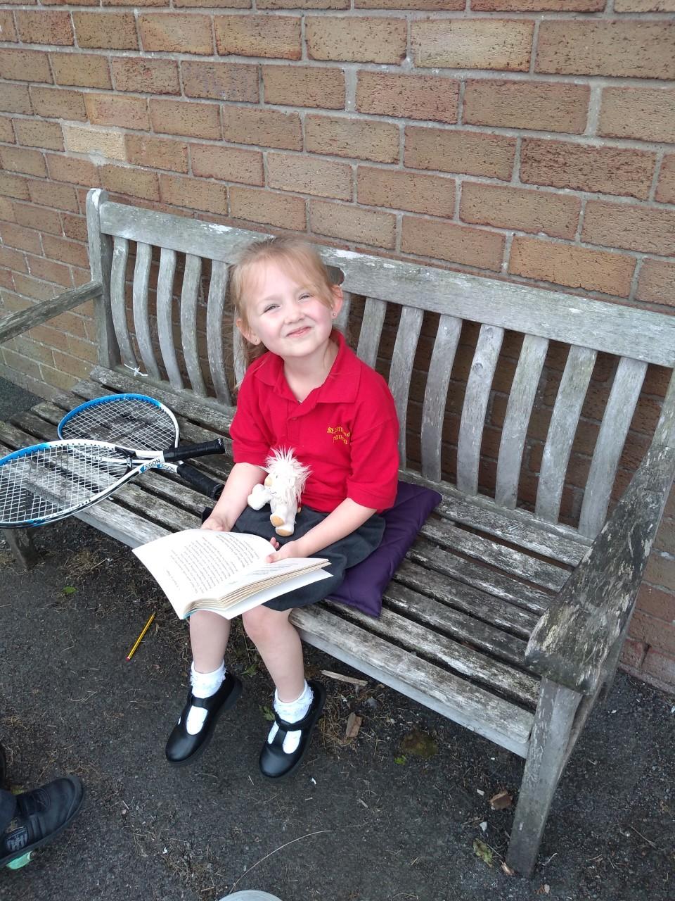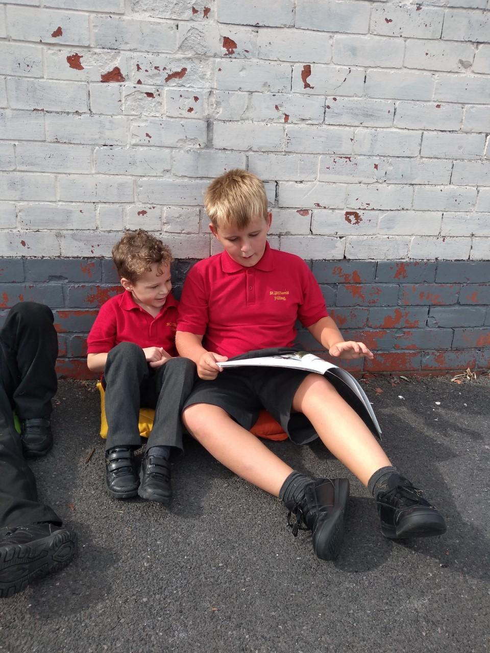 The library is set up outside in the playground, where children can borrow a book to share with a friend or read quietly by themselves. The older children, and members of staff, read stories to our younger children who are just starting out on their reading journey.
