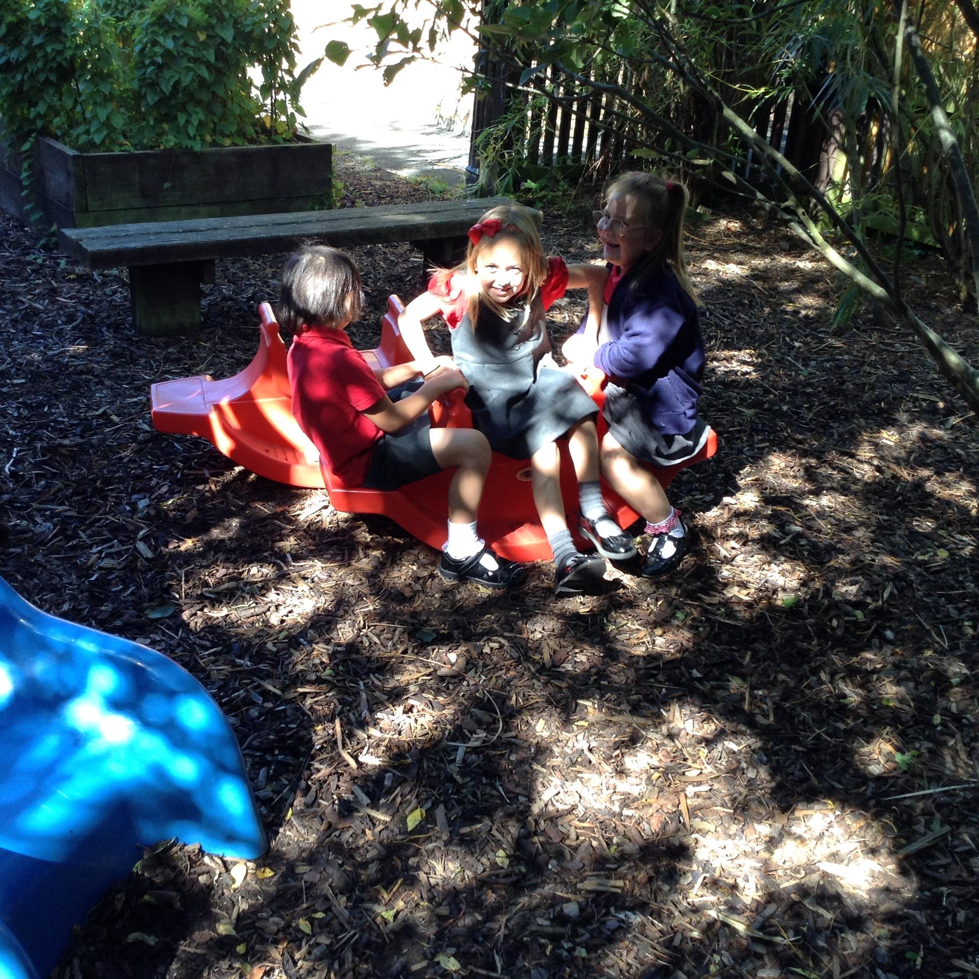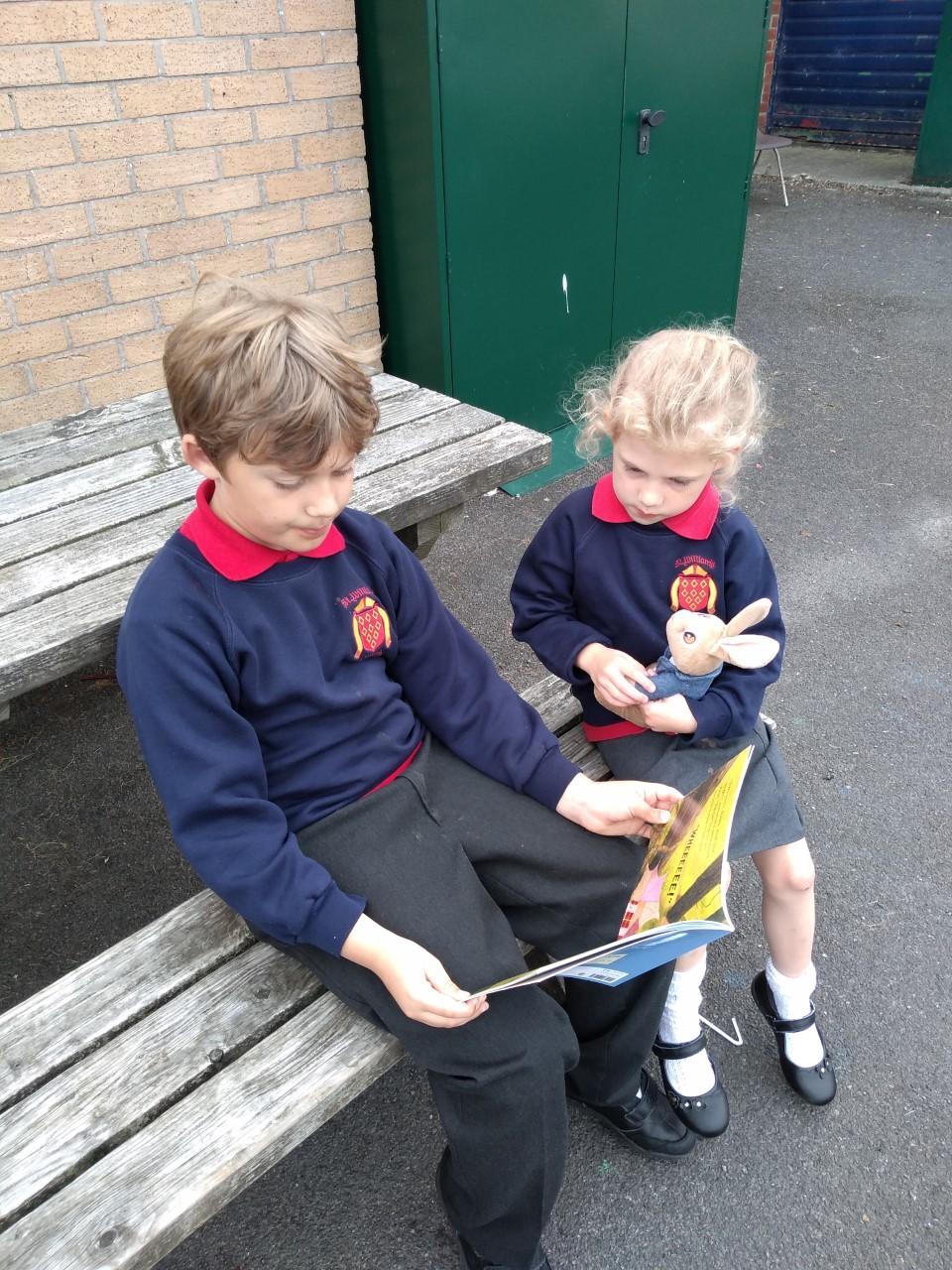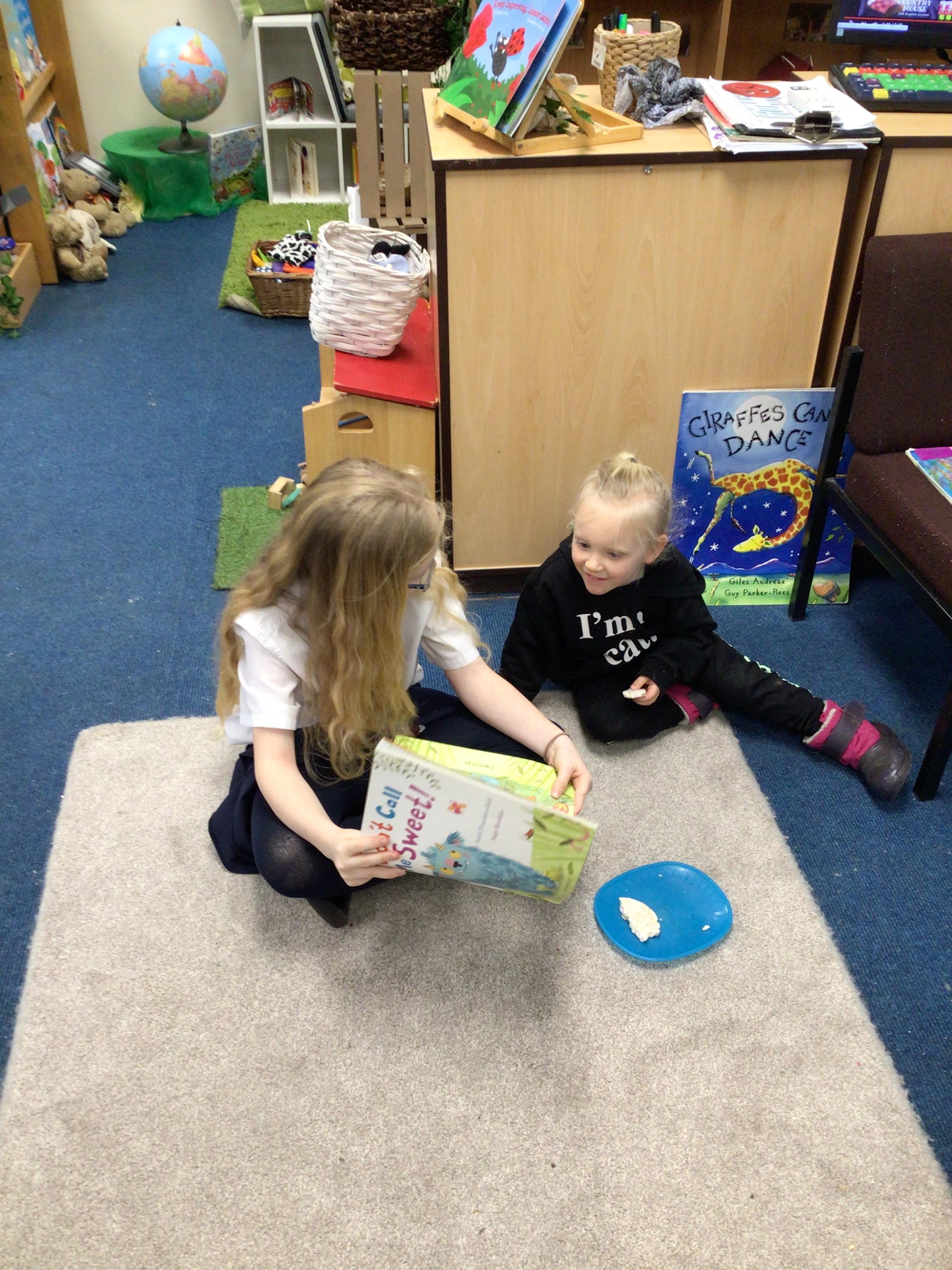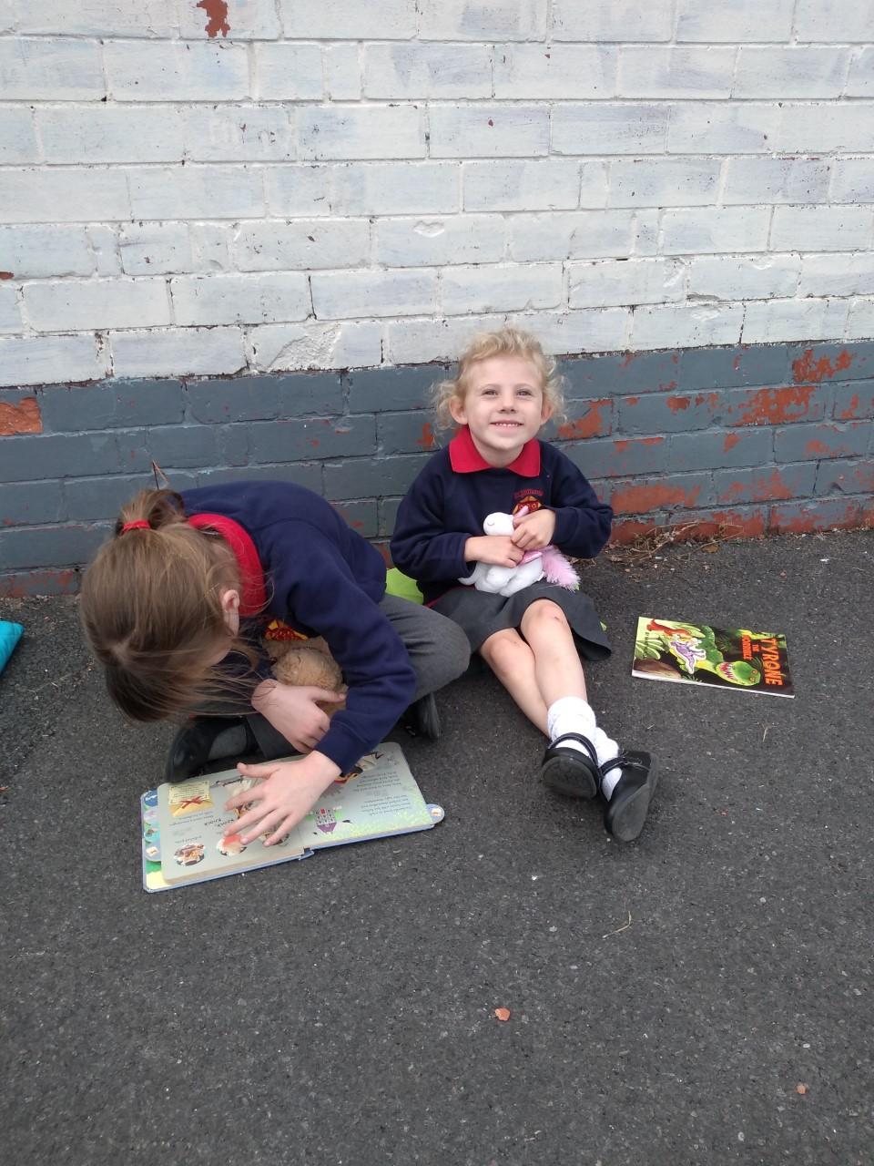 The library is set up outside in the playground, where children can borrow a book to share with a friend or read quietly by themselves. The older children, and members of staff, read stories to our younger children who are just starting out on their reading journey.