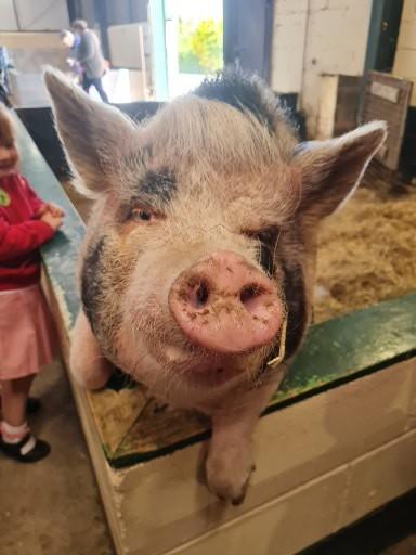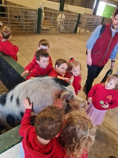 We met Flower (the pig). The children spotted different foods that Flower had in her pen, this led into conversation about how diets differ for the different animals and humans. The children found it fascinating that some animals have a similar diet to humans. They were also very intrigued by how Eric the Cow used his tongue to pull up long grass in the fields.
