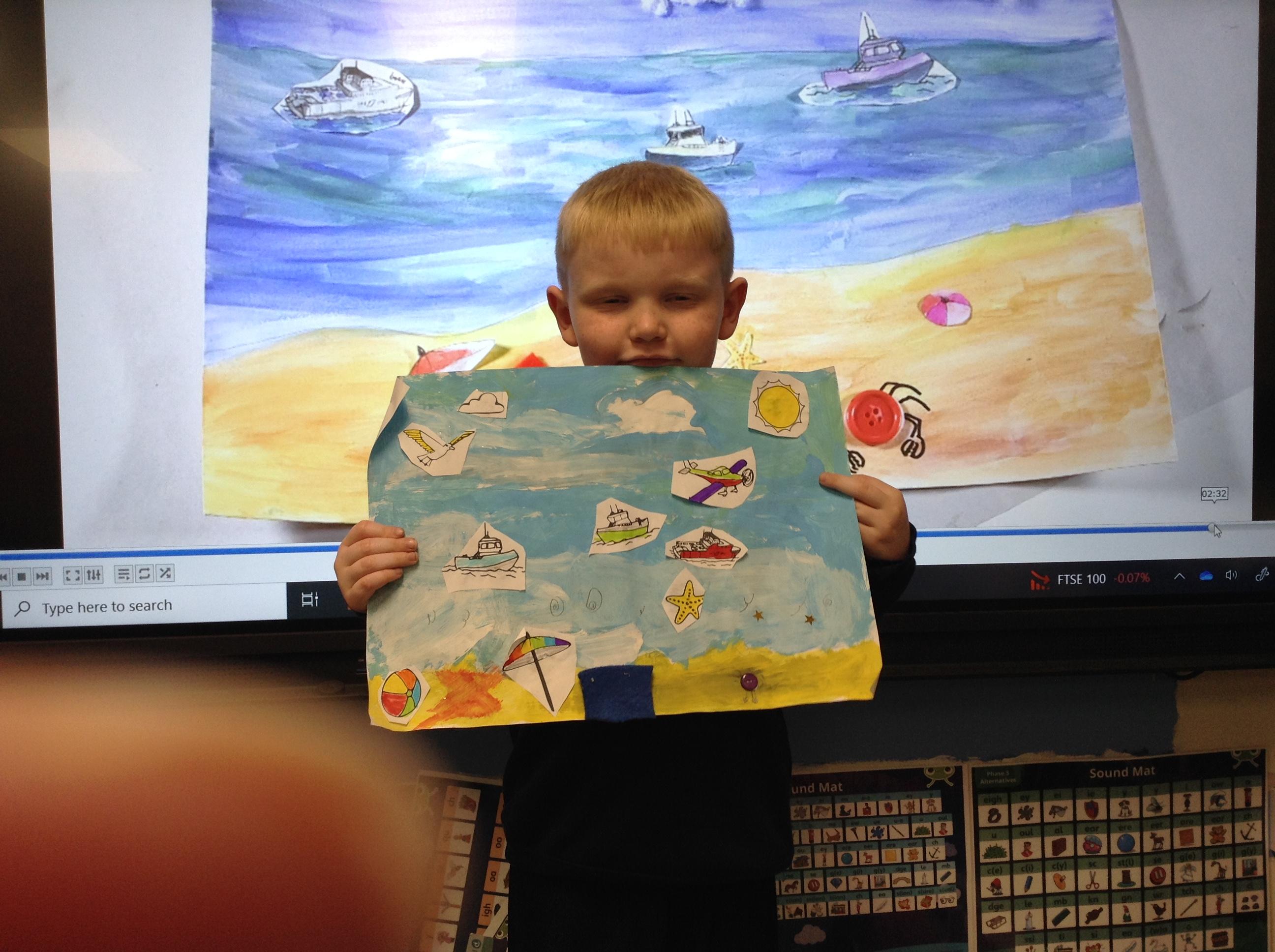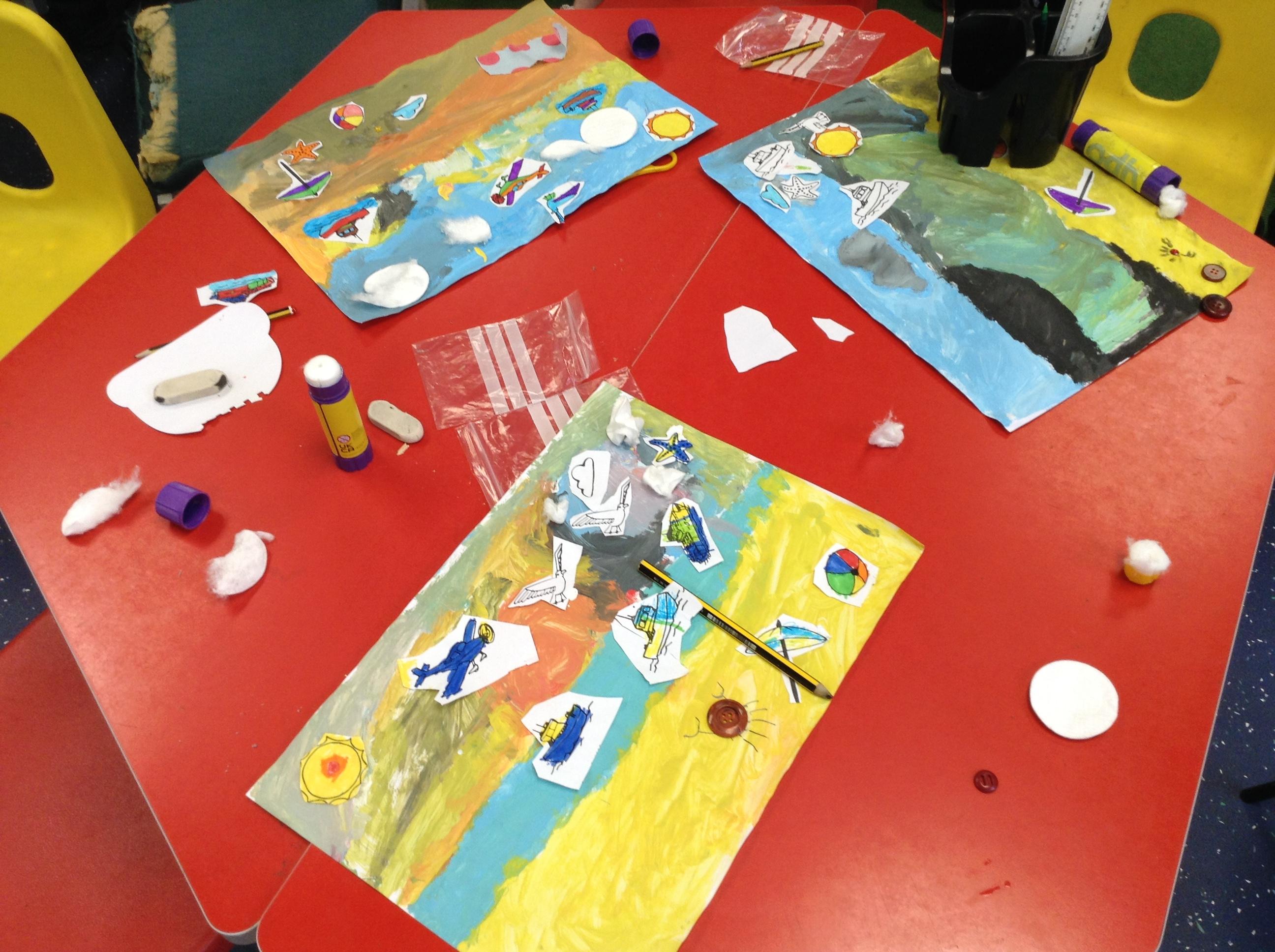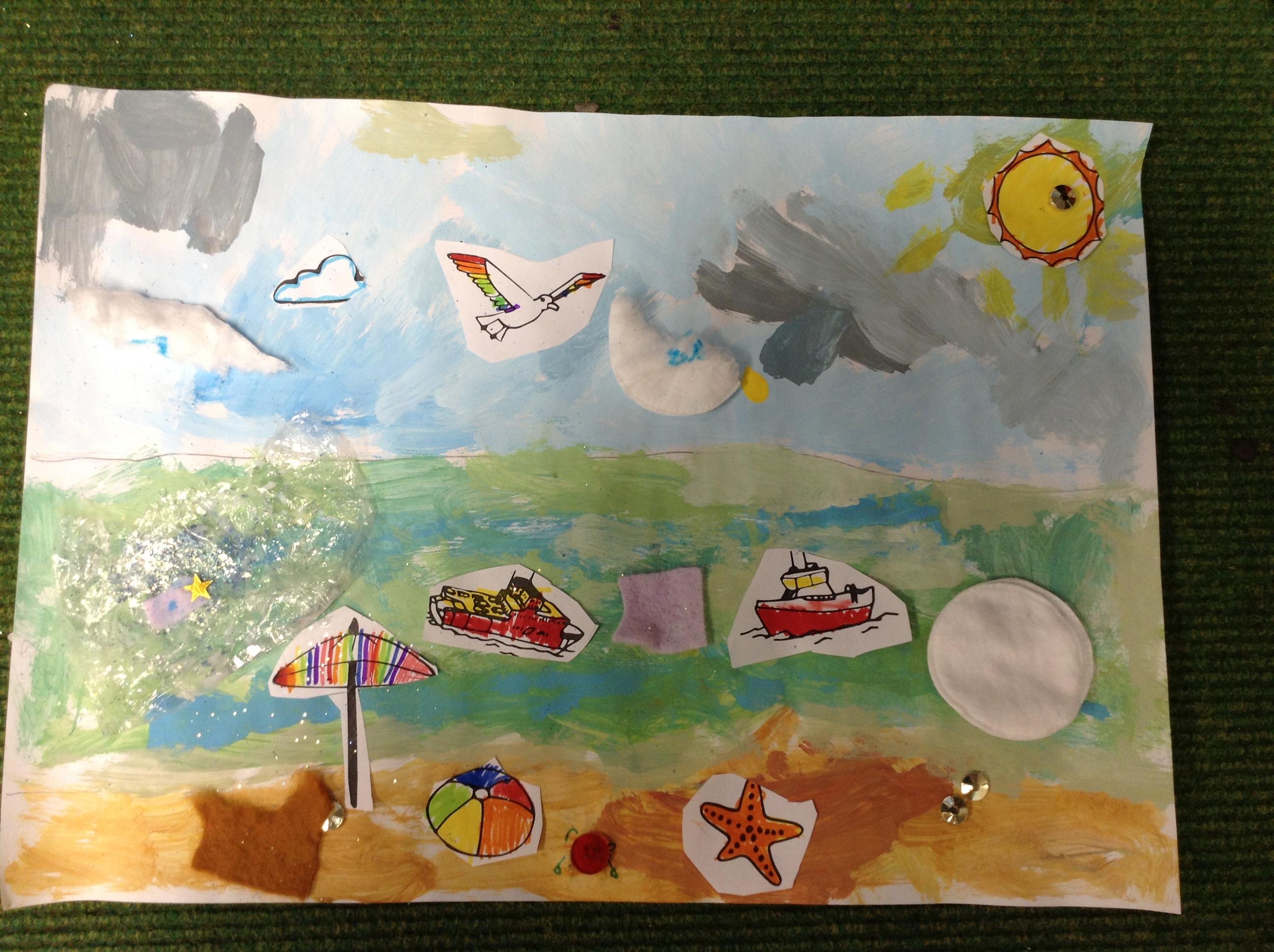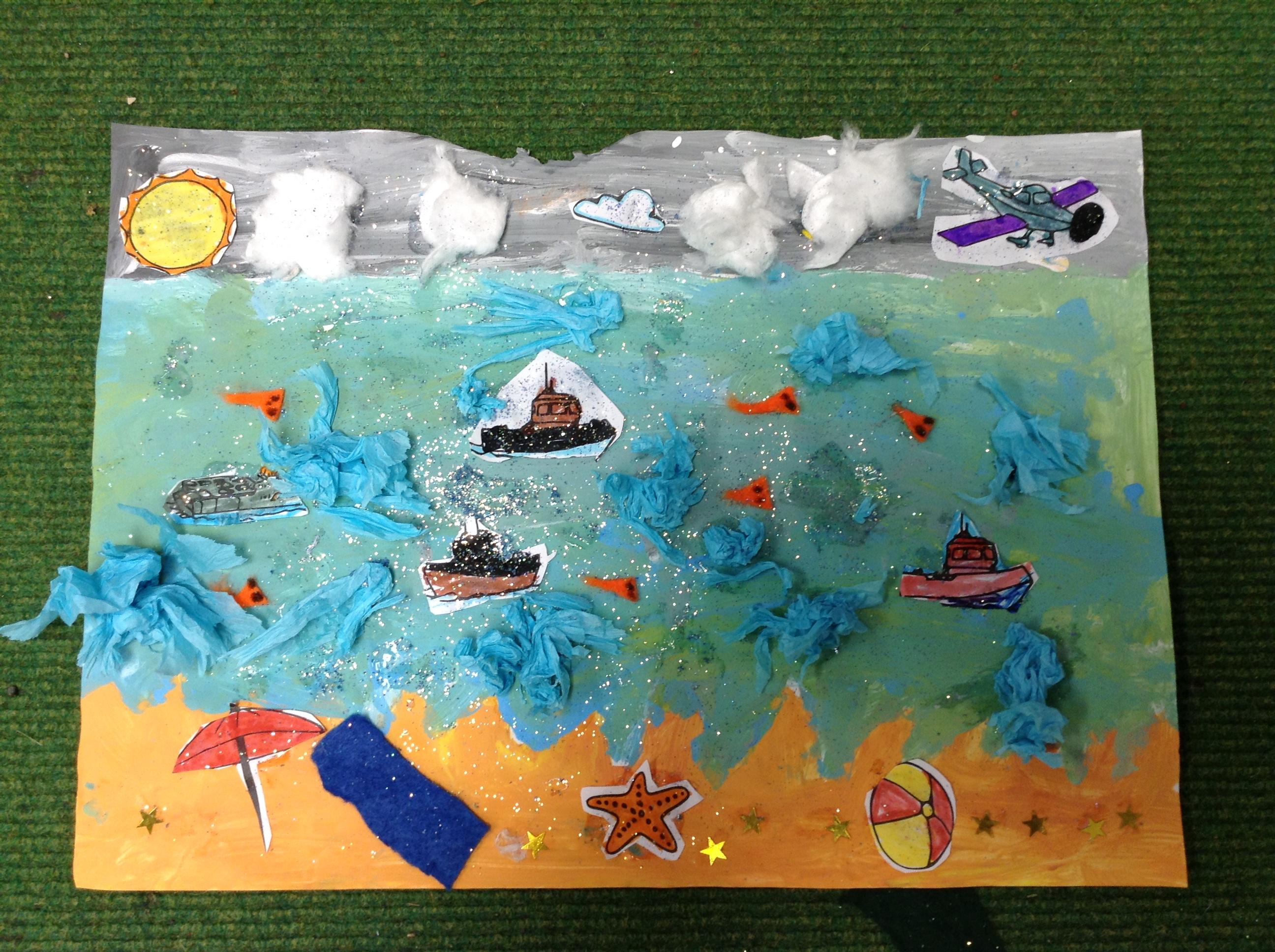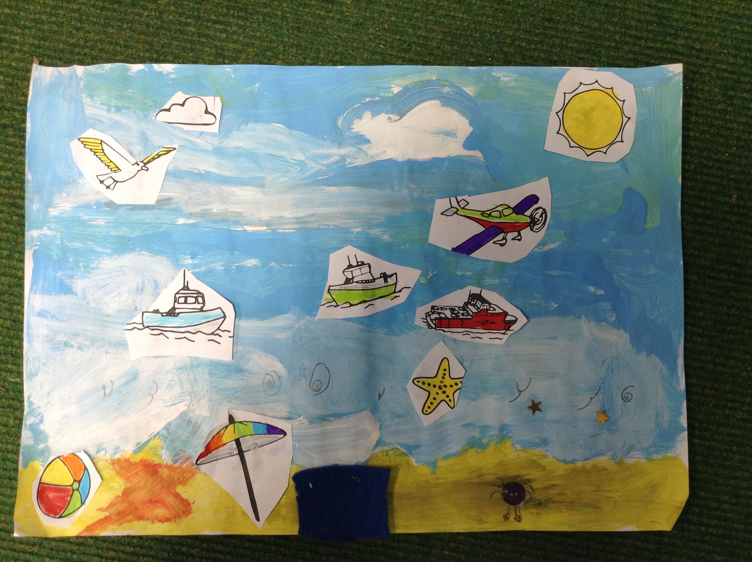 The children in Class 1 created wall displays ready for the corridor wall displays. Reception showed the difference between dark and light, Year 1 looked at sea and sky and finally Year 2 looked at land and sea.