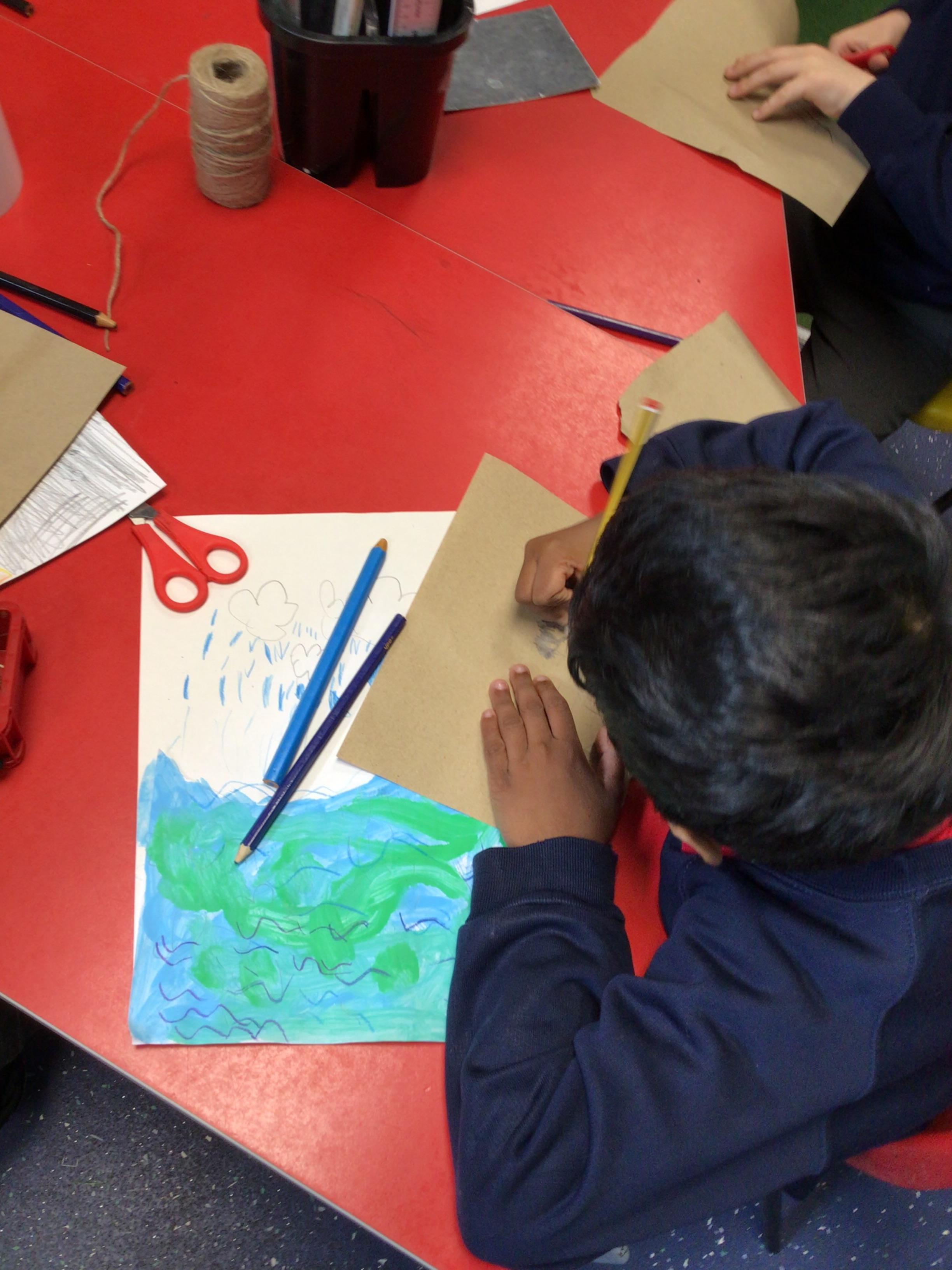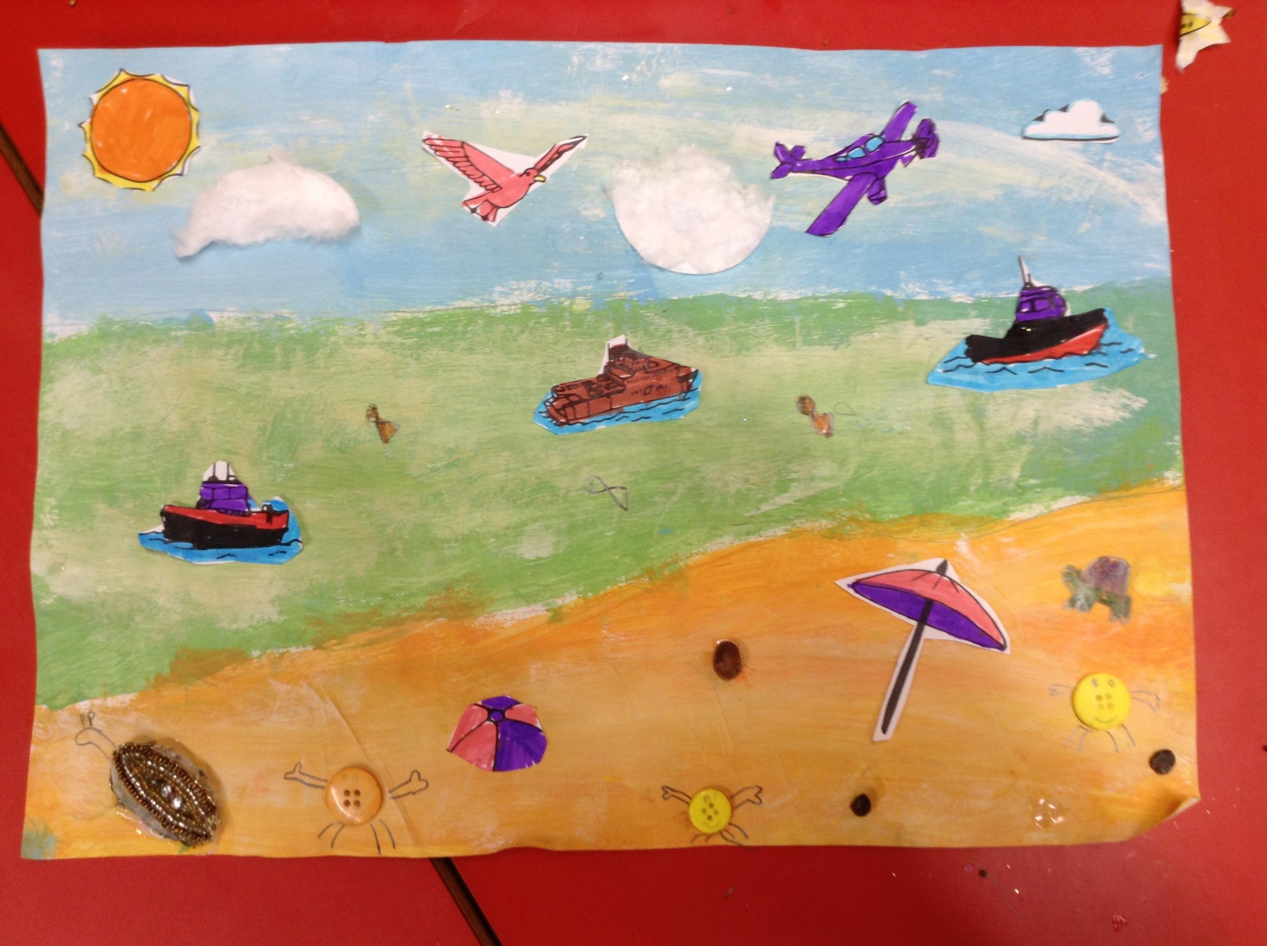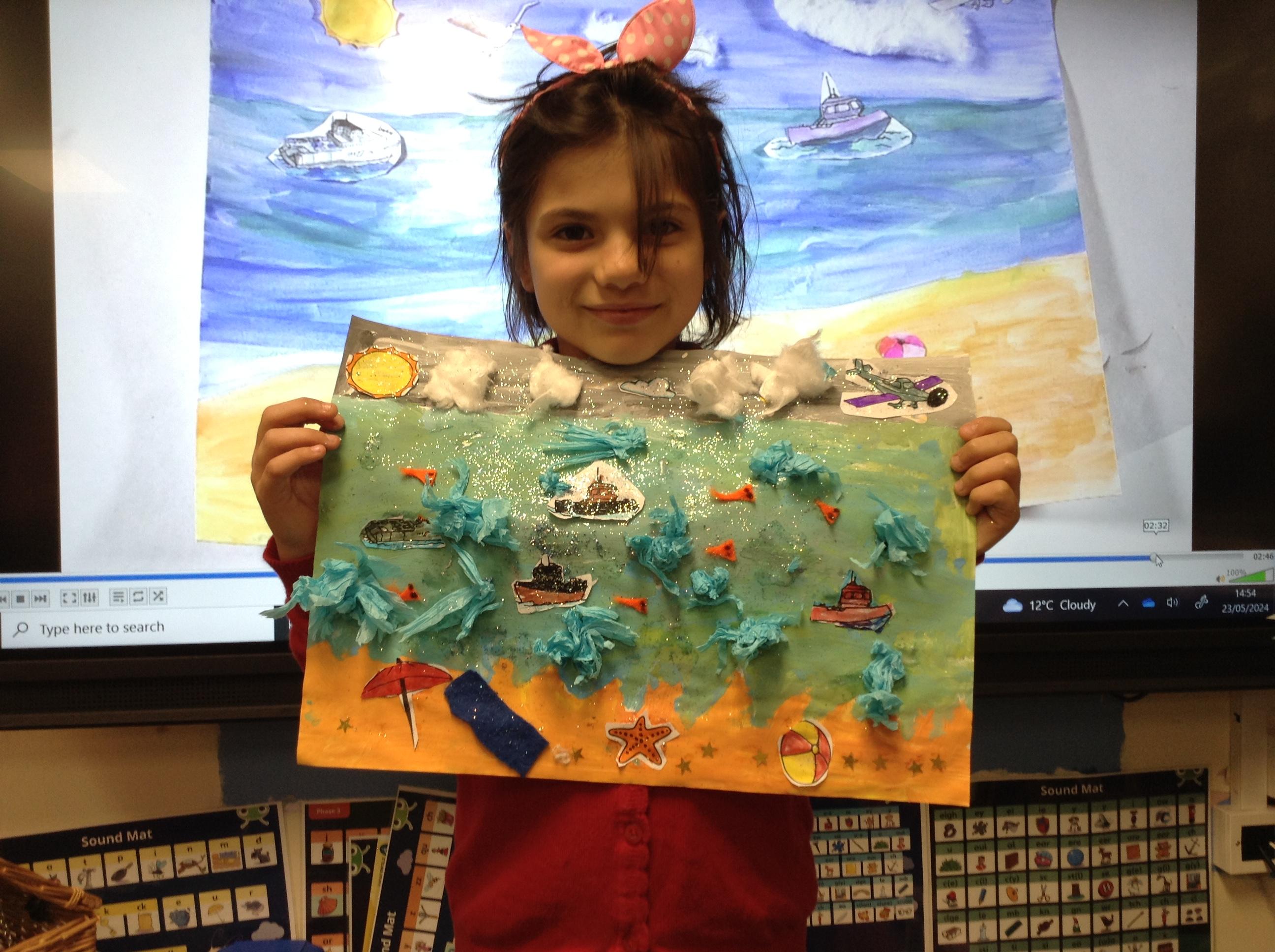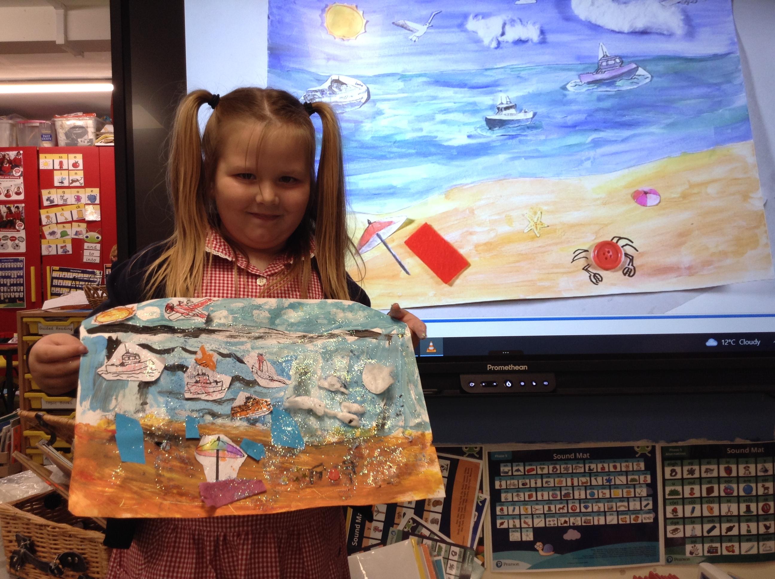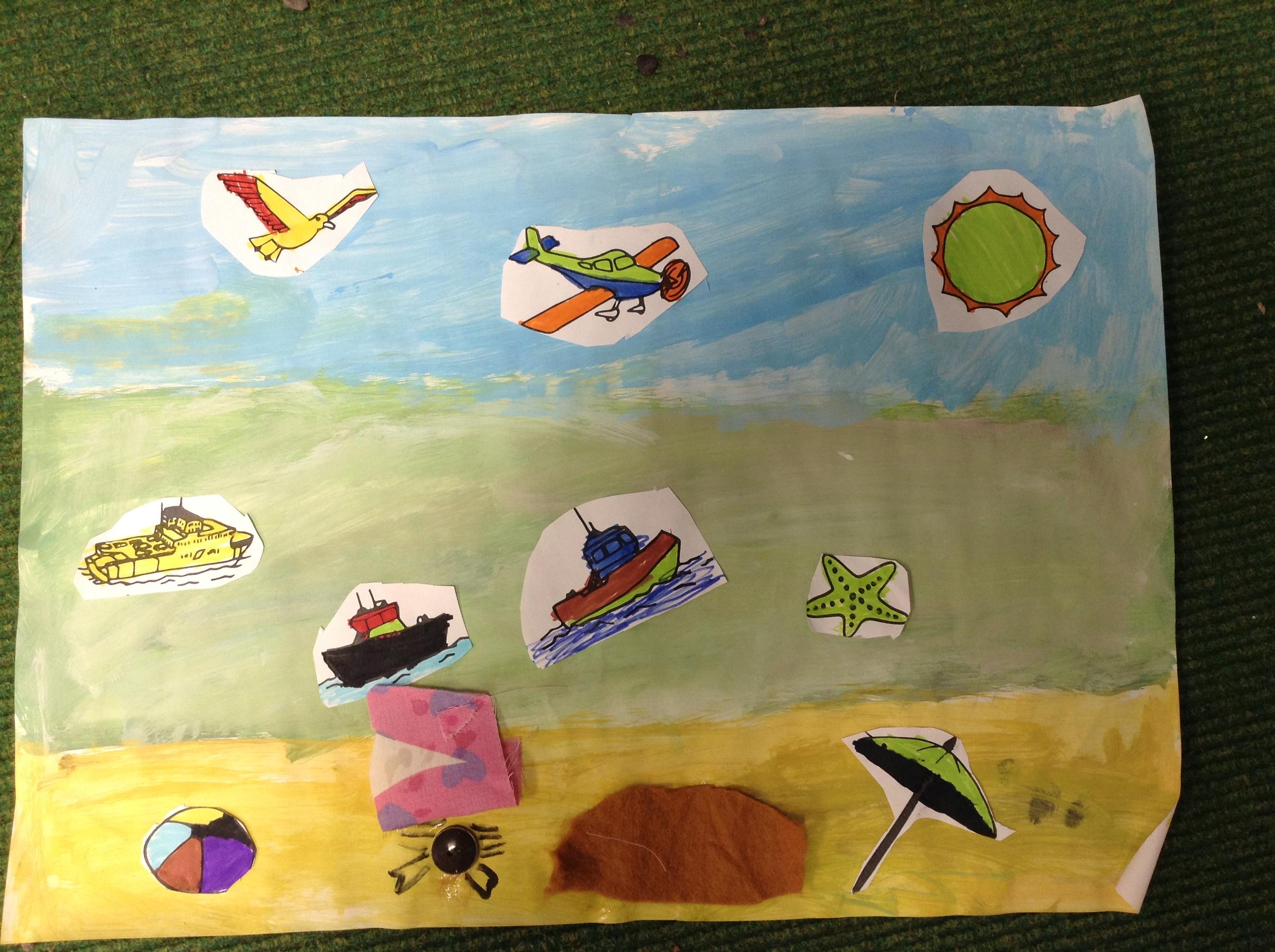 The children in Class 1 created wall displays ready for the corridor wall displays. Reception showed the difference between dark and light, Year 1 looked at sea and sky and finally Year 2 looked at land and sea.