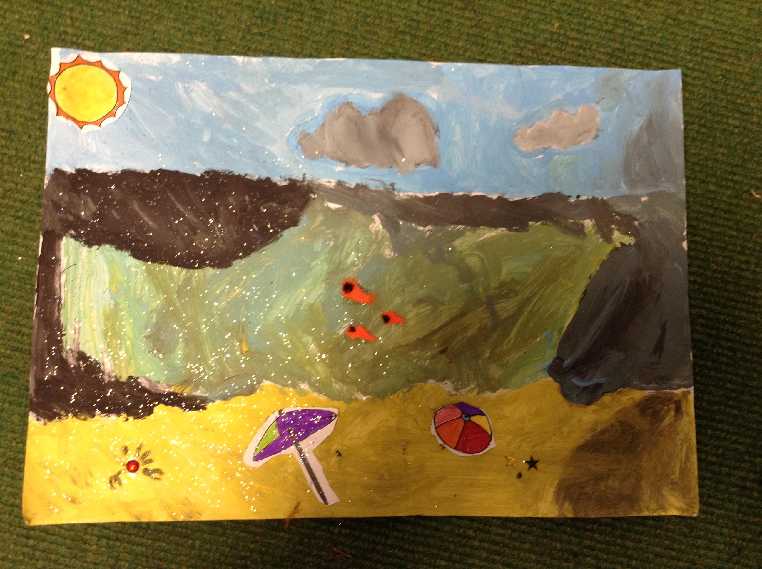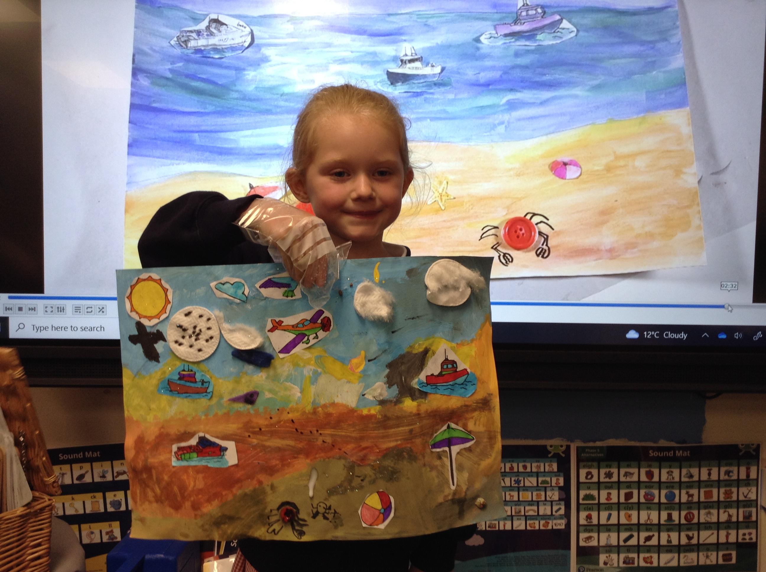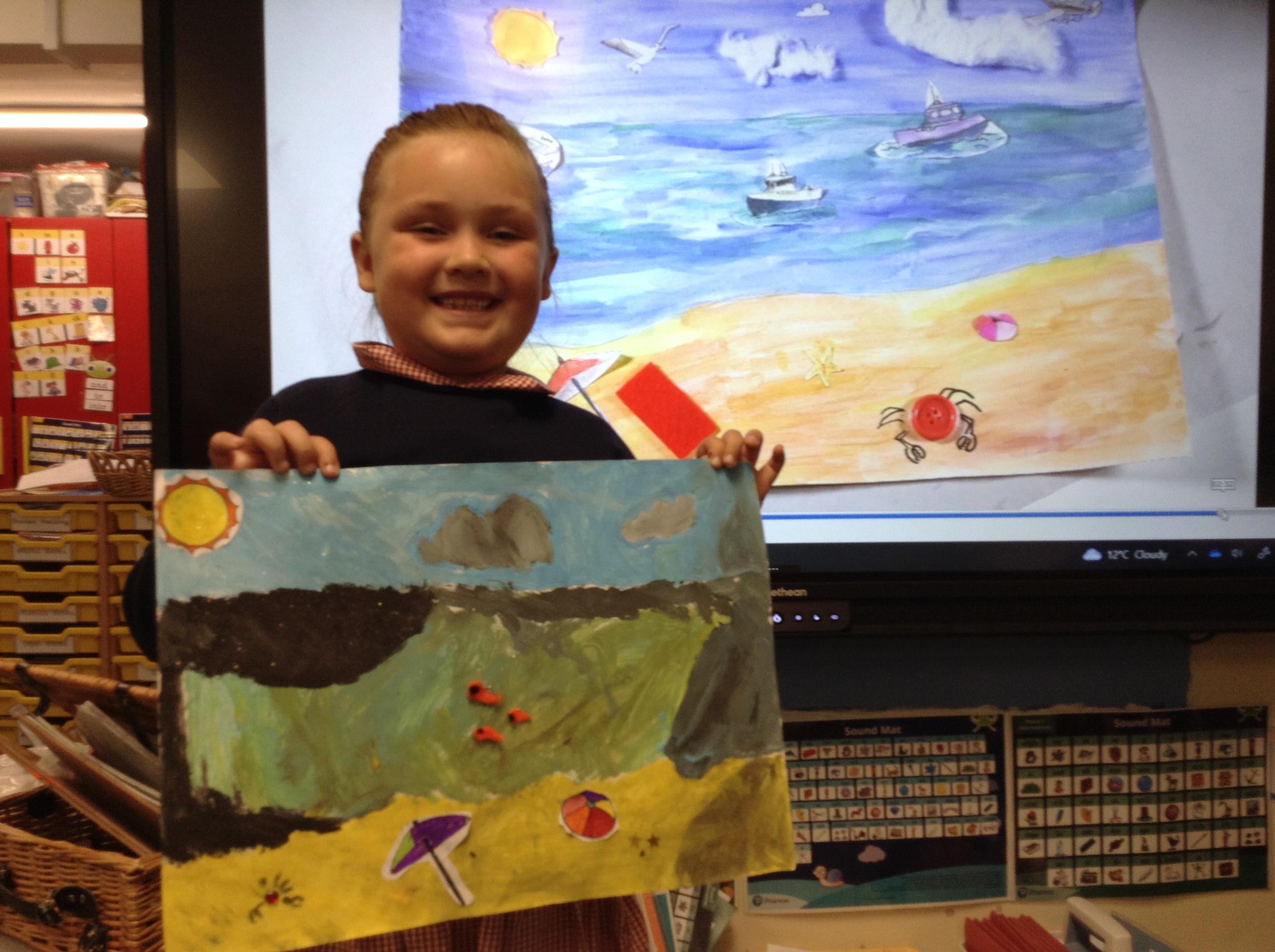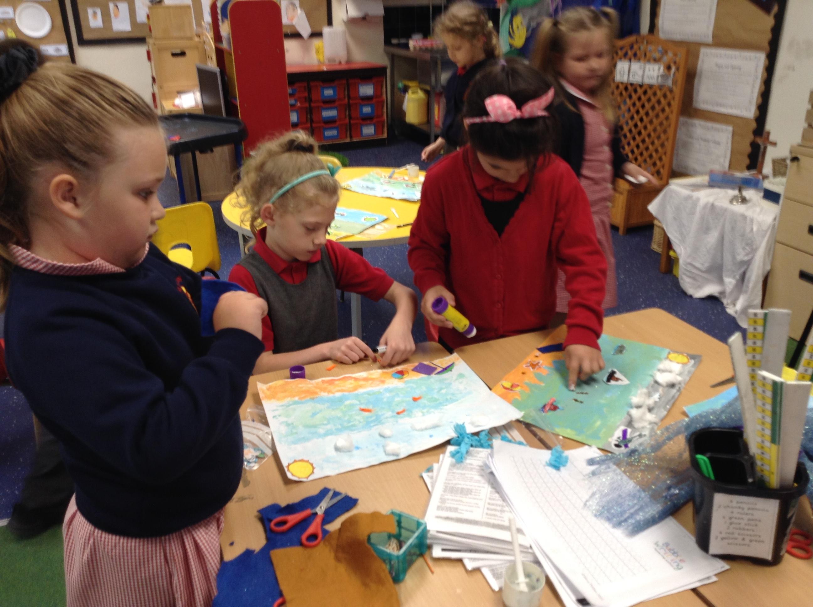 The children in Class 1 created wall displays ready for the corridor wall displays. Reception showed the difference between dark and light, Year 1 looked at sea and sky and finally Year 2 looked at land and sea.