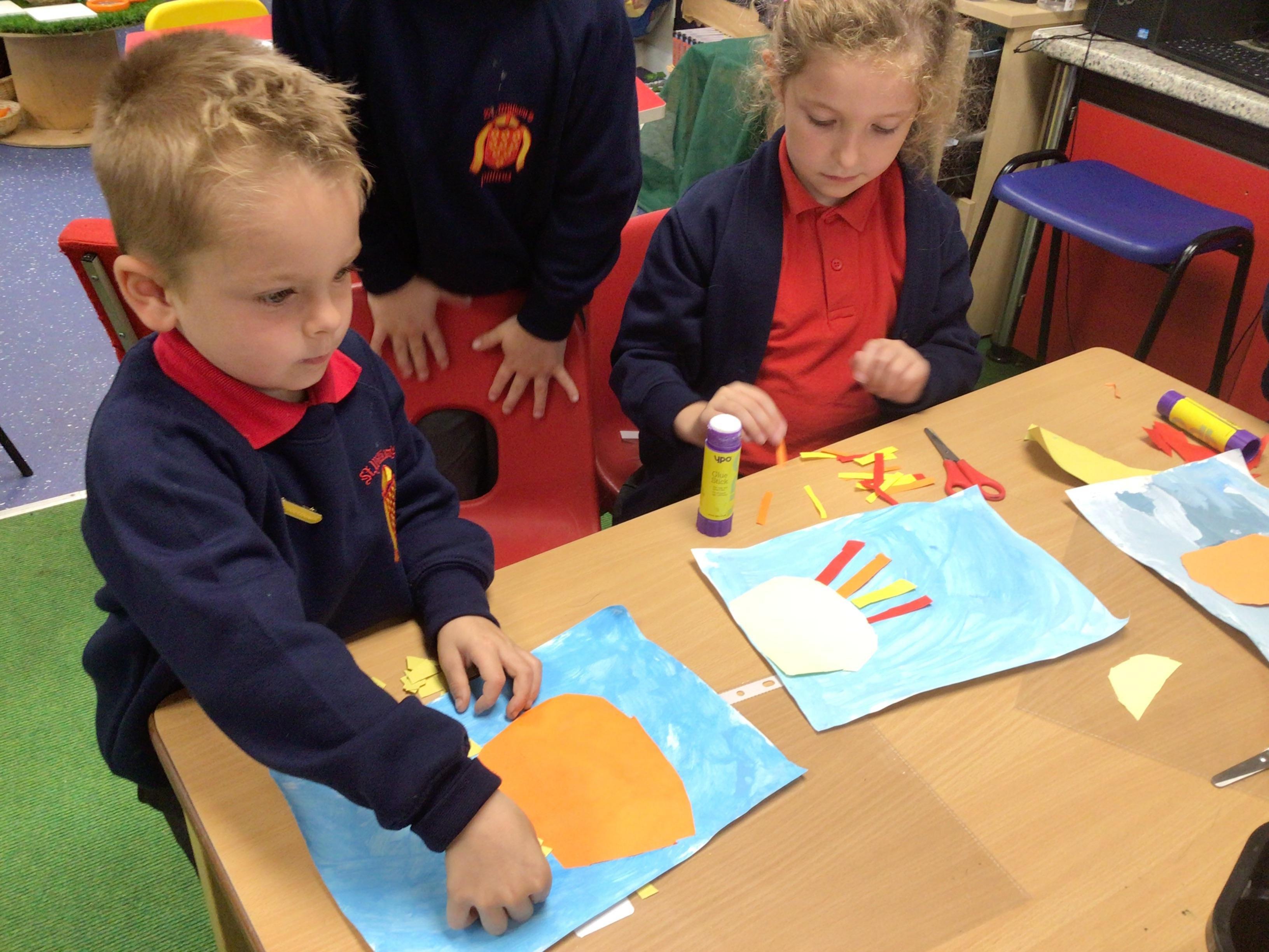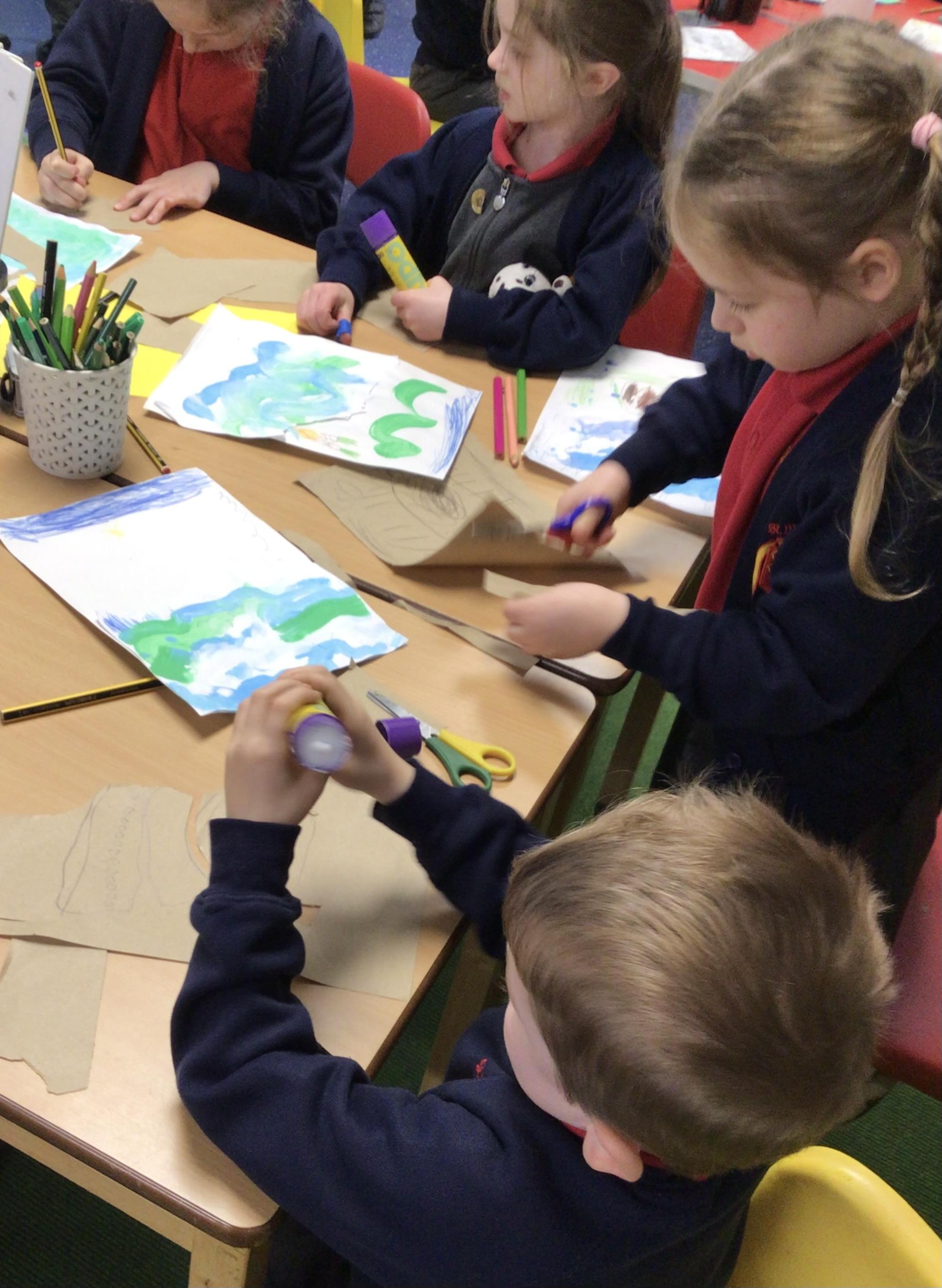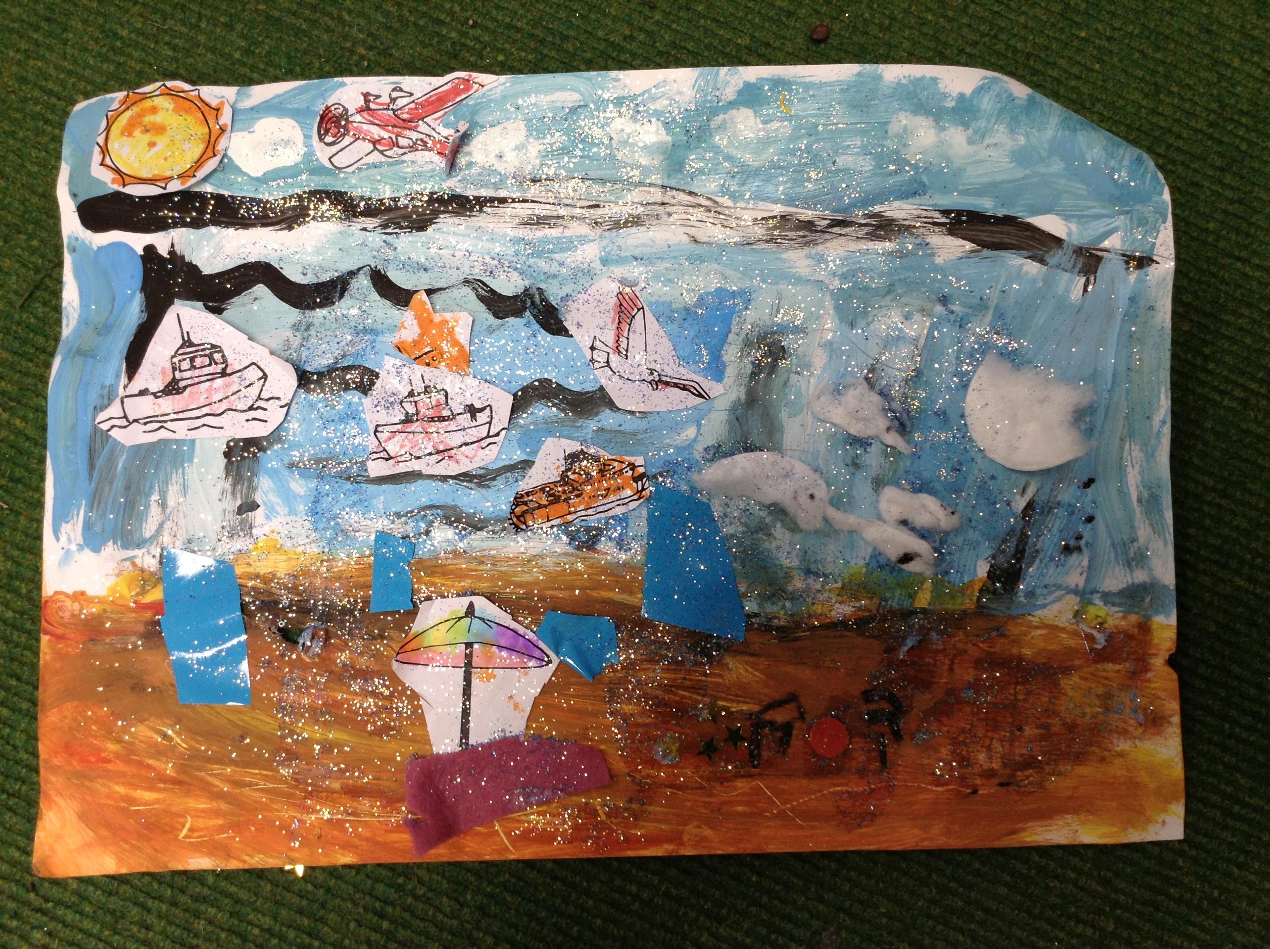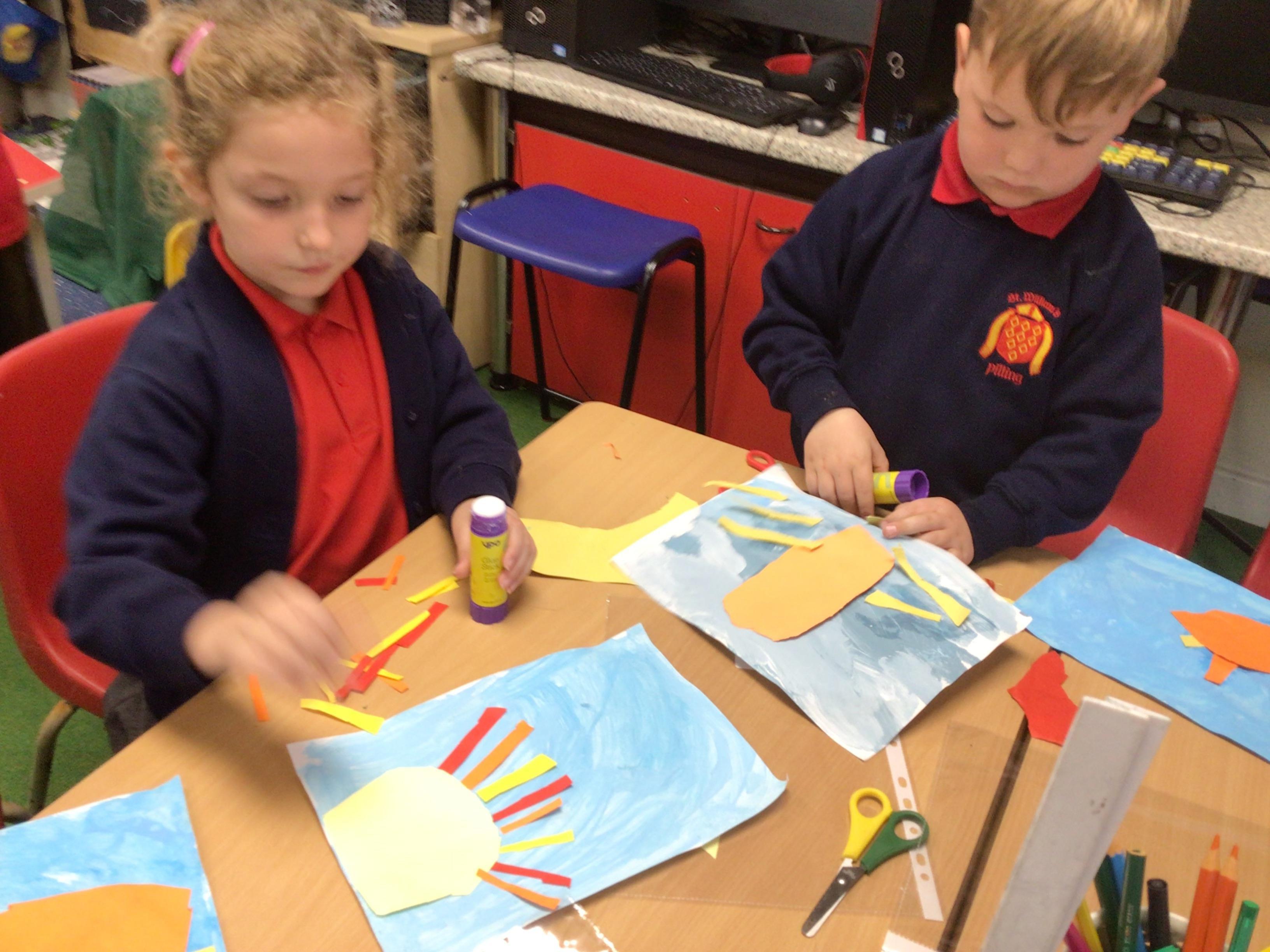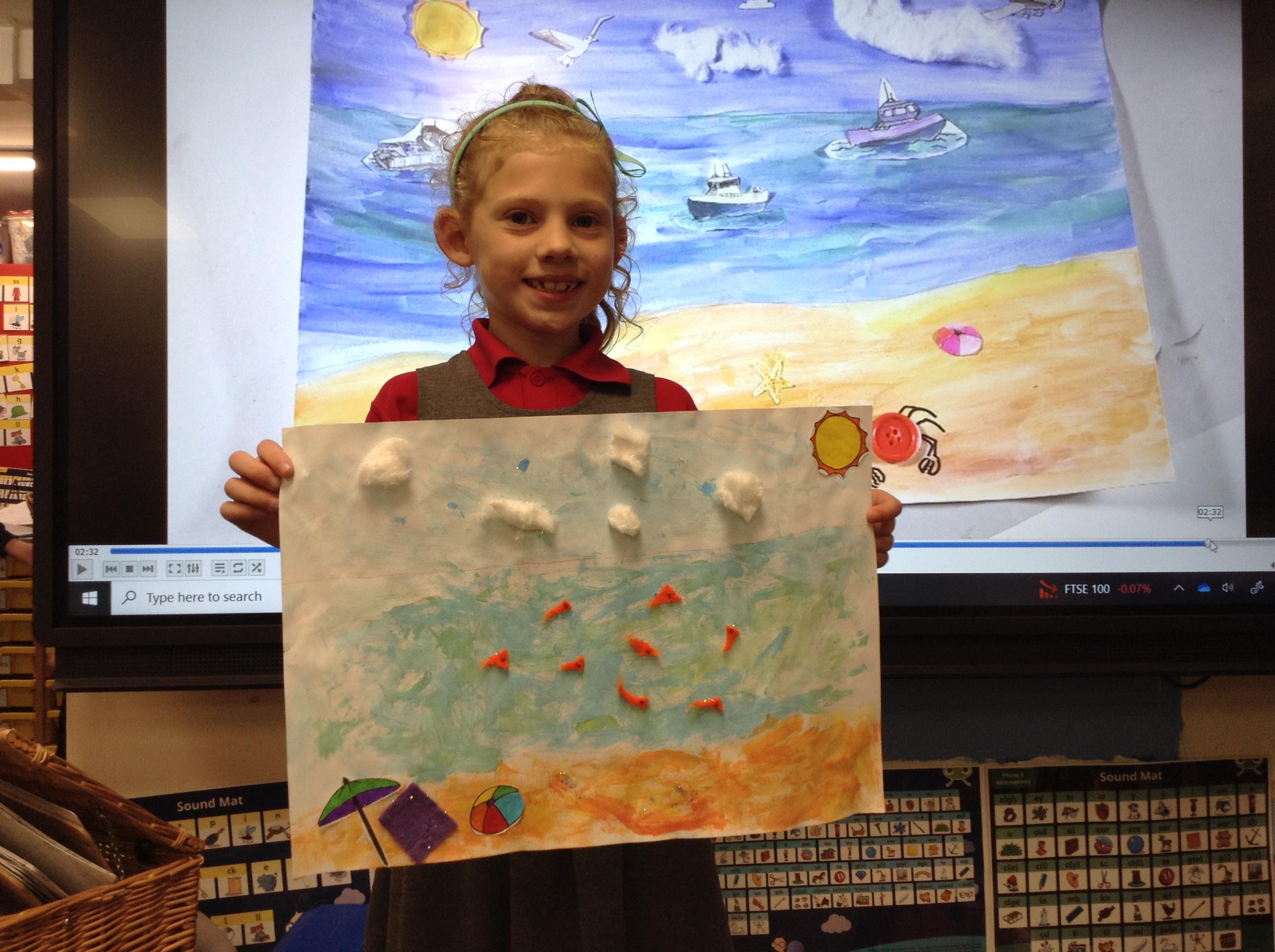 The children in Class 1 created wall displays ready for the corridor wall displays. Reception showed the difference between dark and light, Year 1 looked at sea and sky and finally Year 2 looked at land and sea.