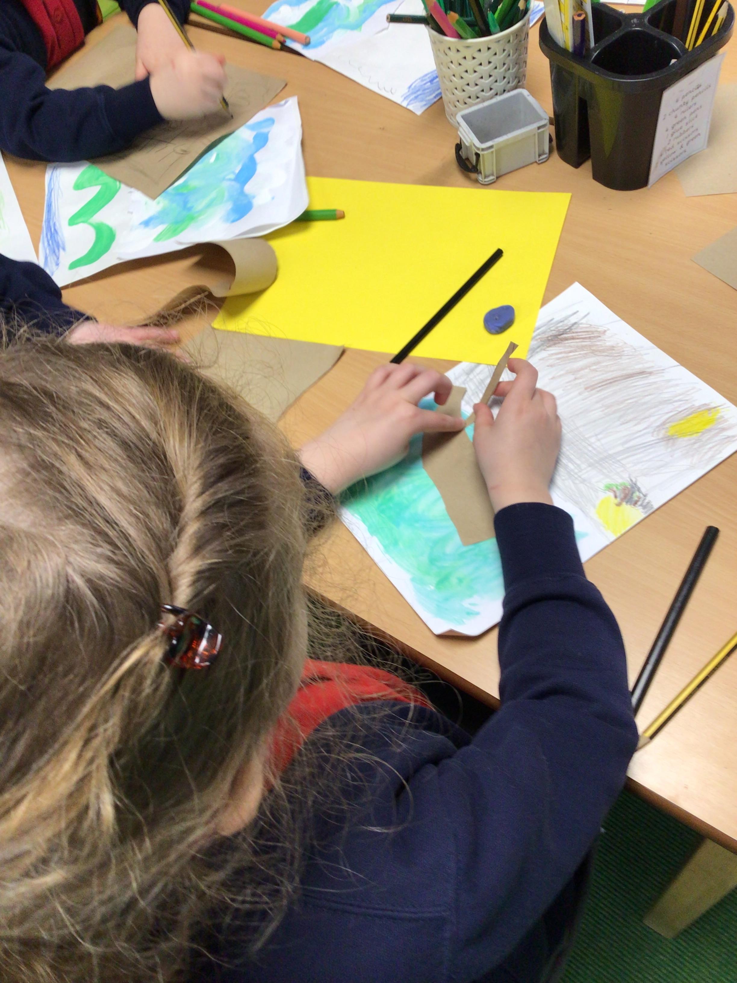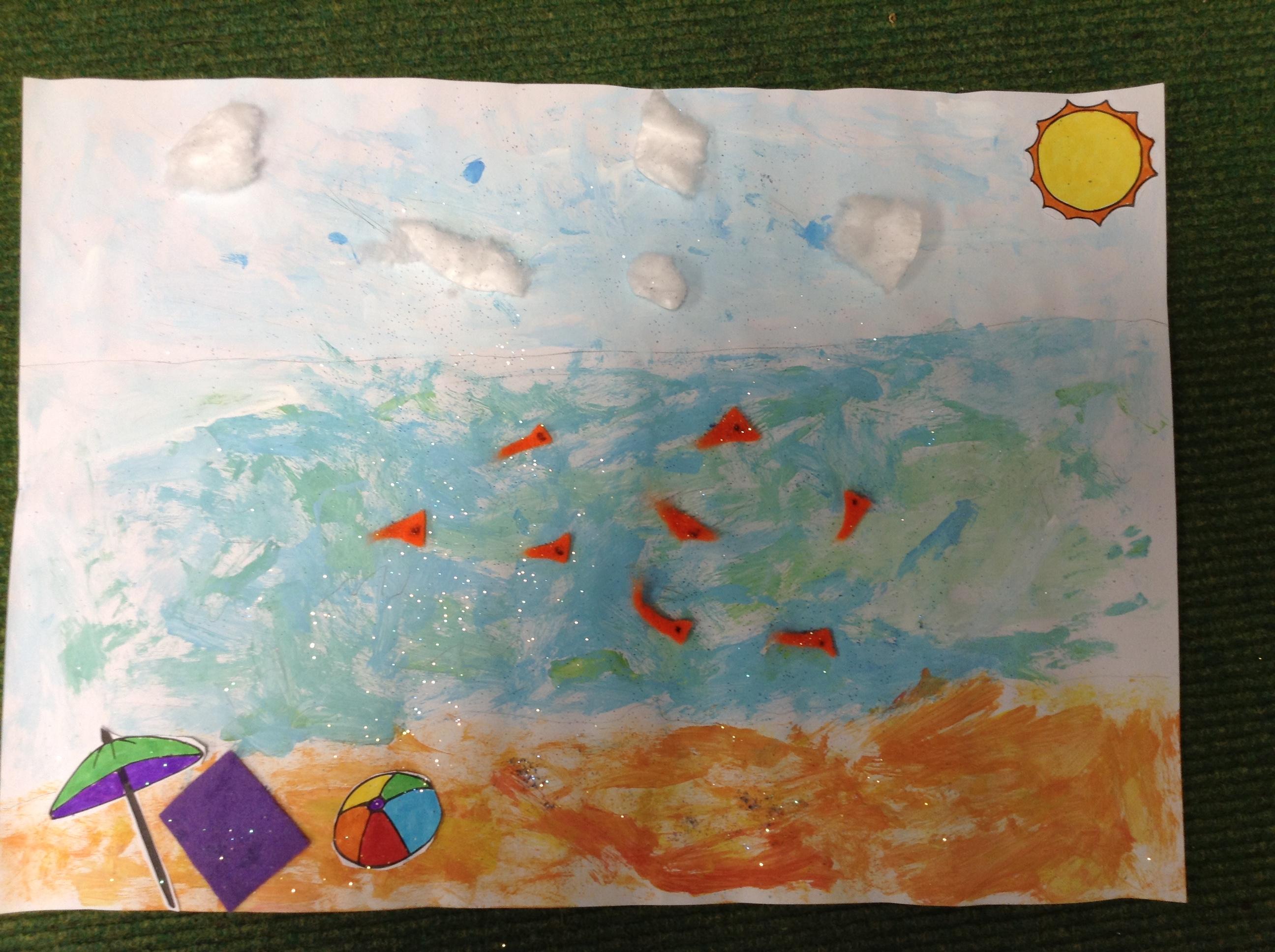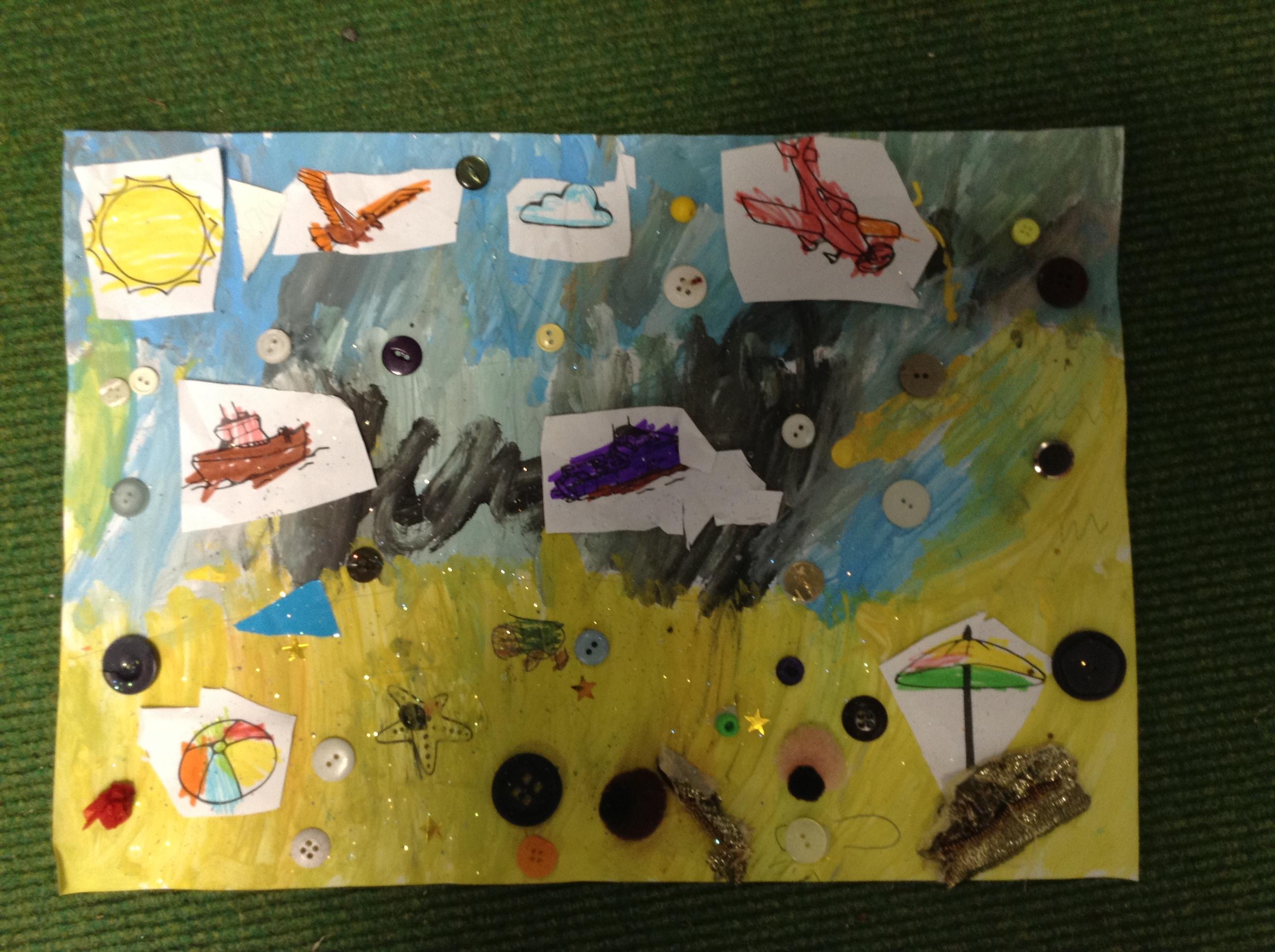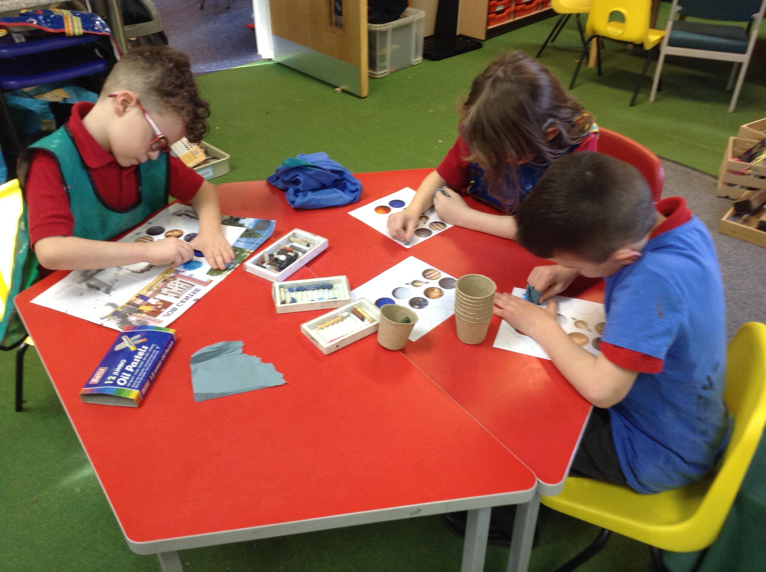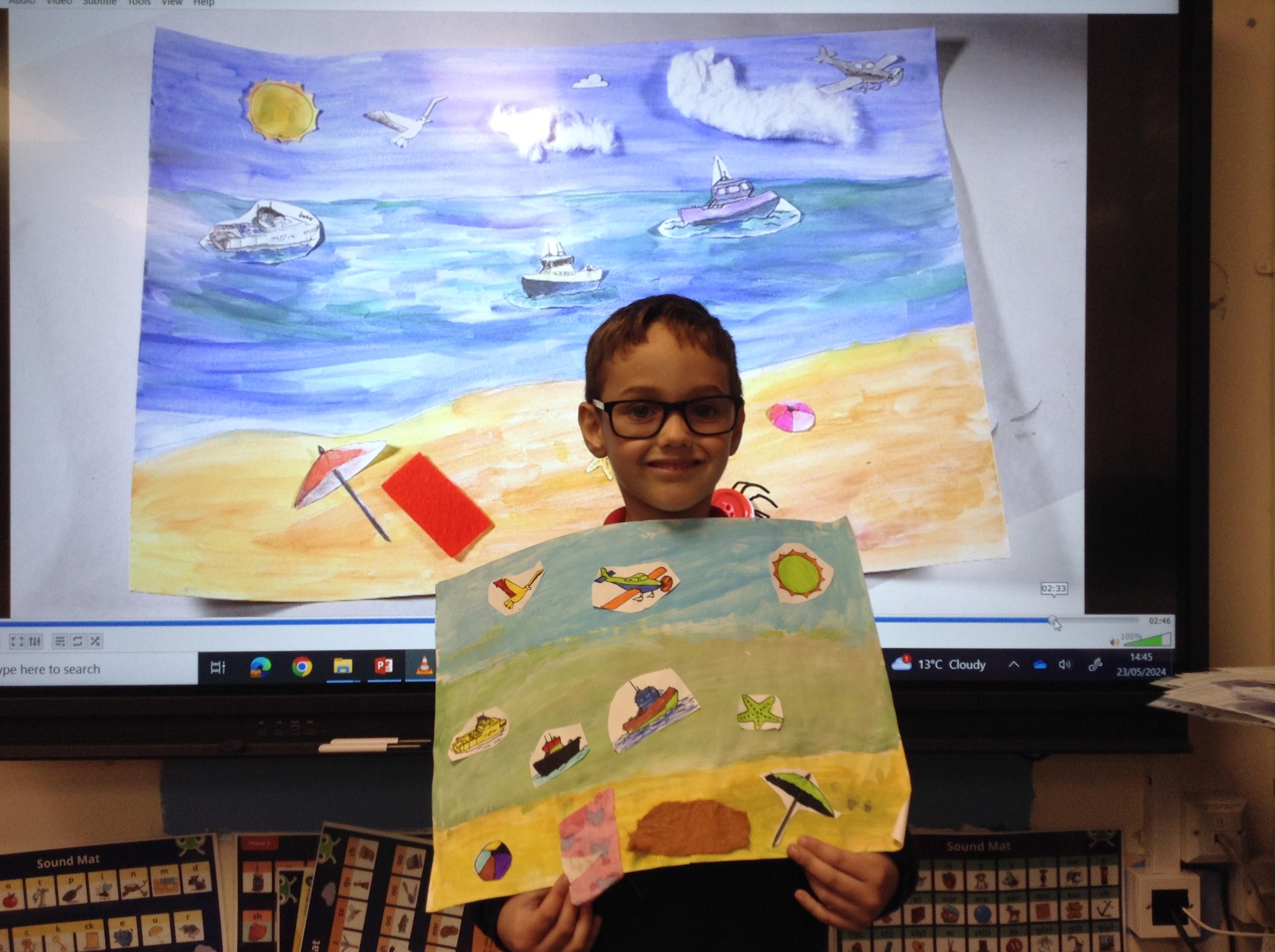 The children in Class 1 created wall displays ready for the corridor wall displays. Reception showed the difference between dark and light, Year 1 looked at sea and sky and finally Year 2 looked at land and sea.