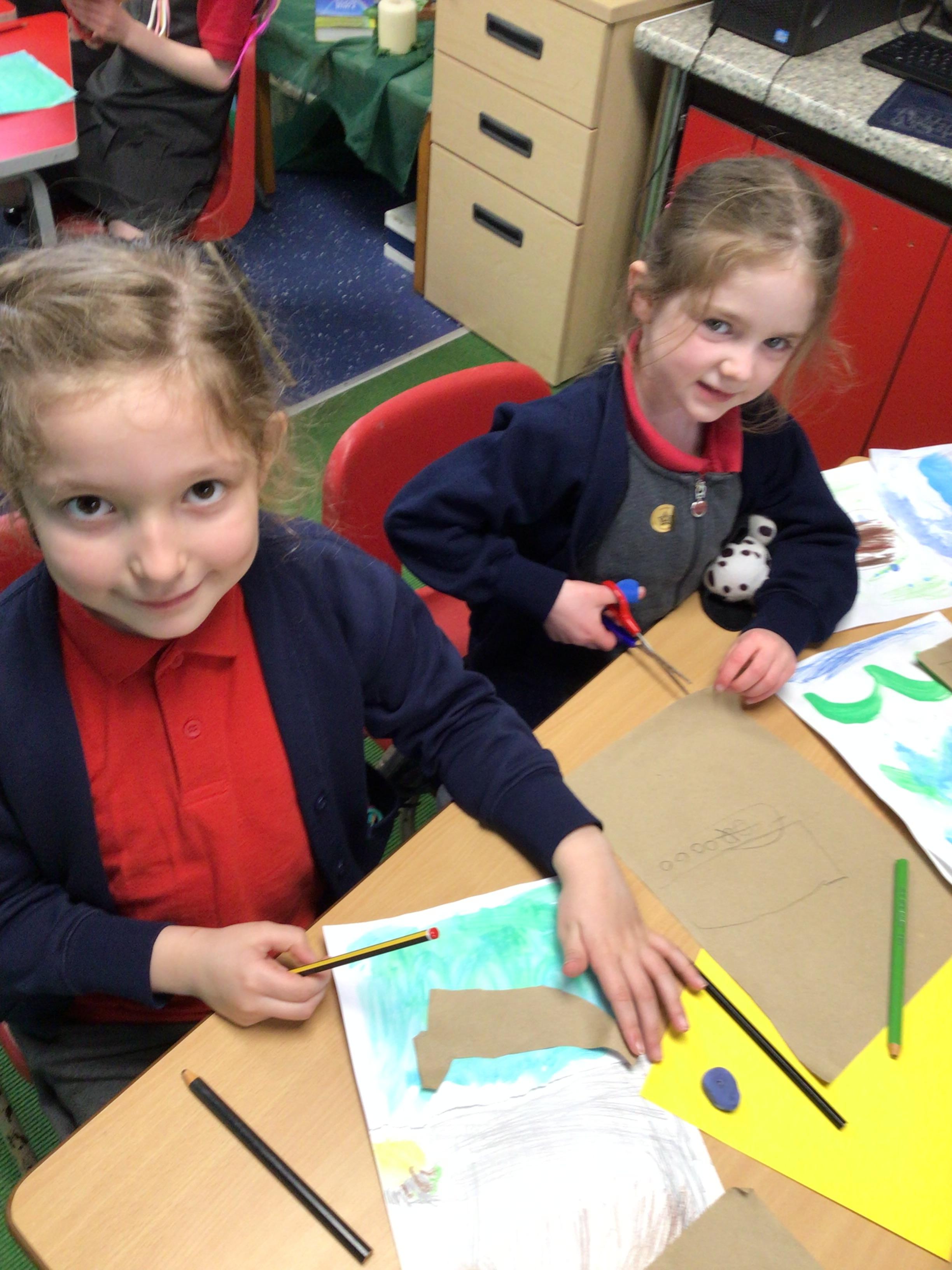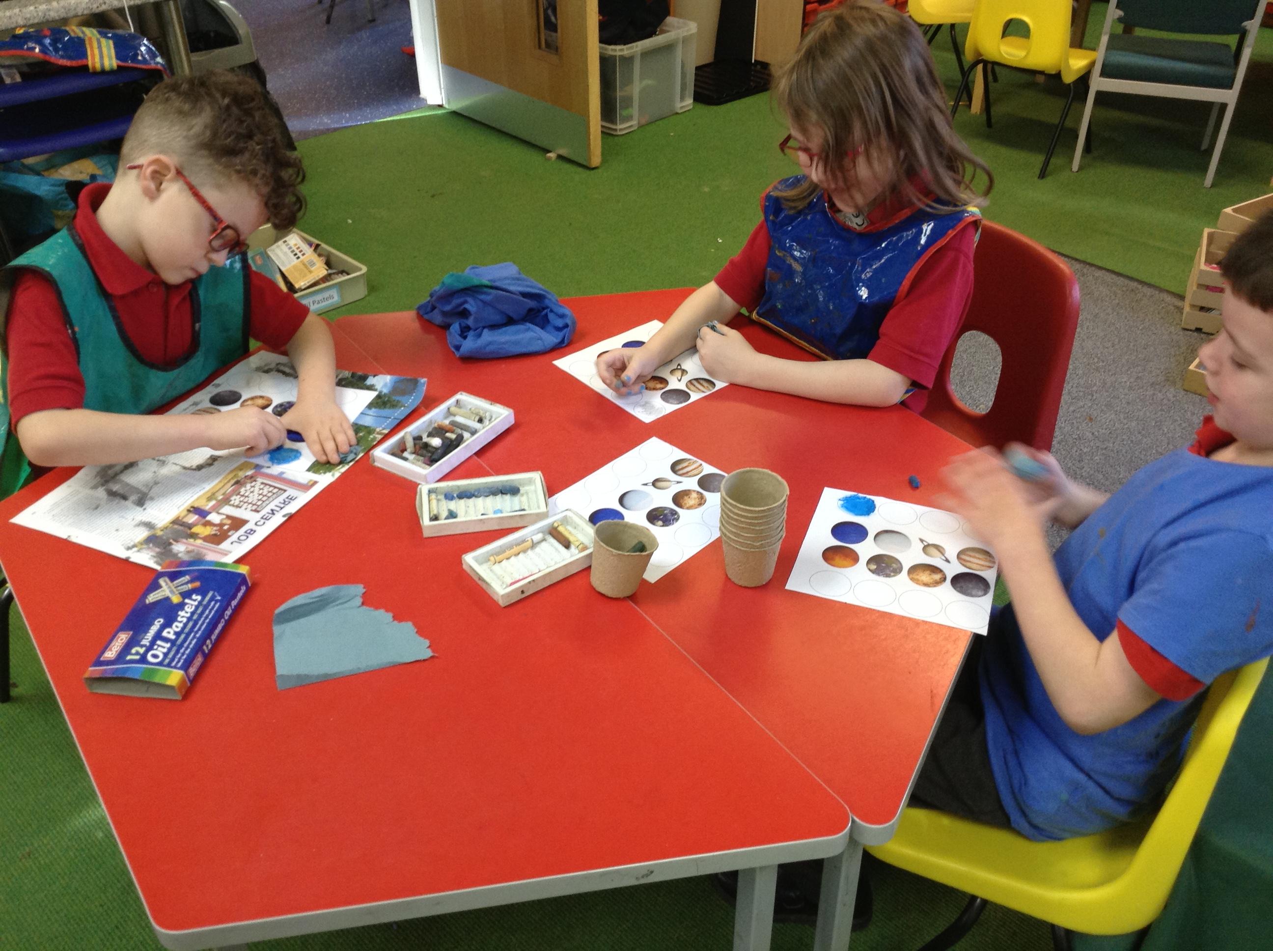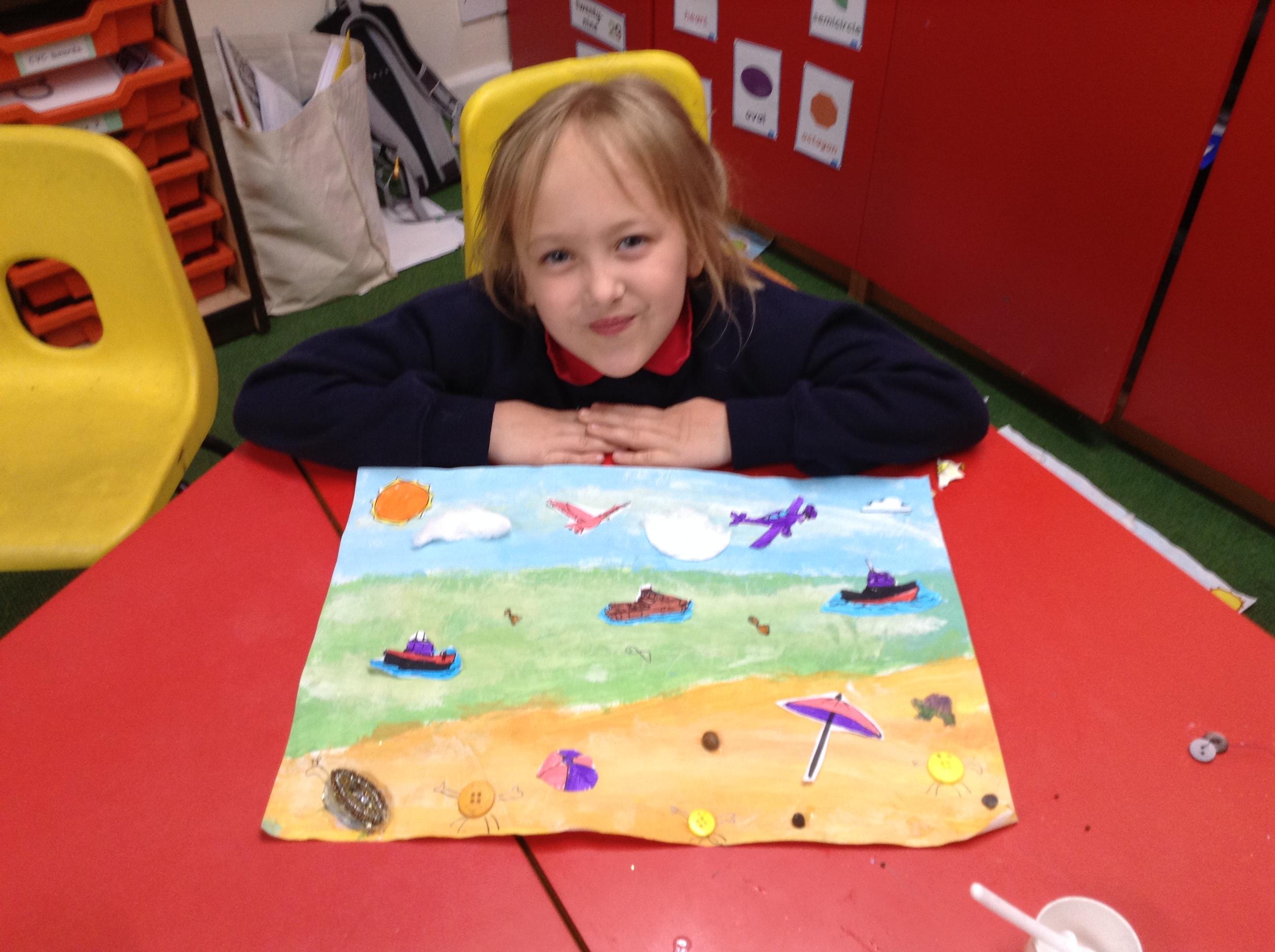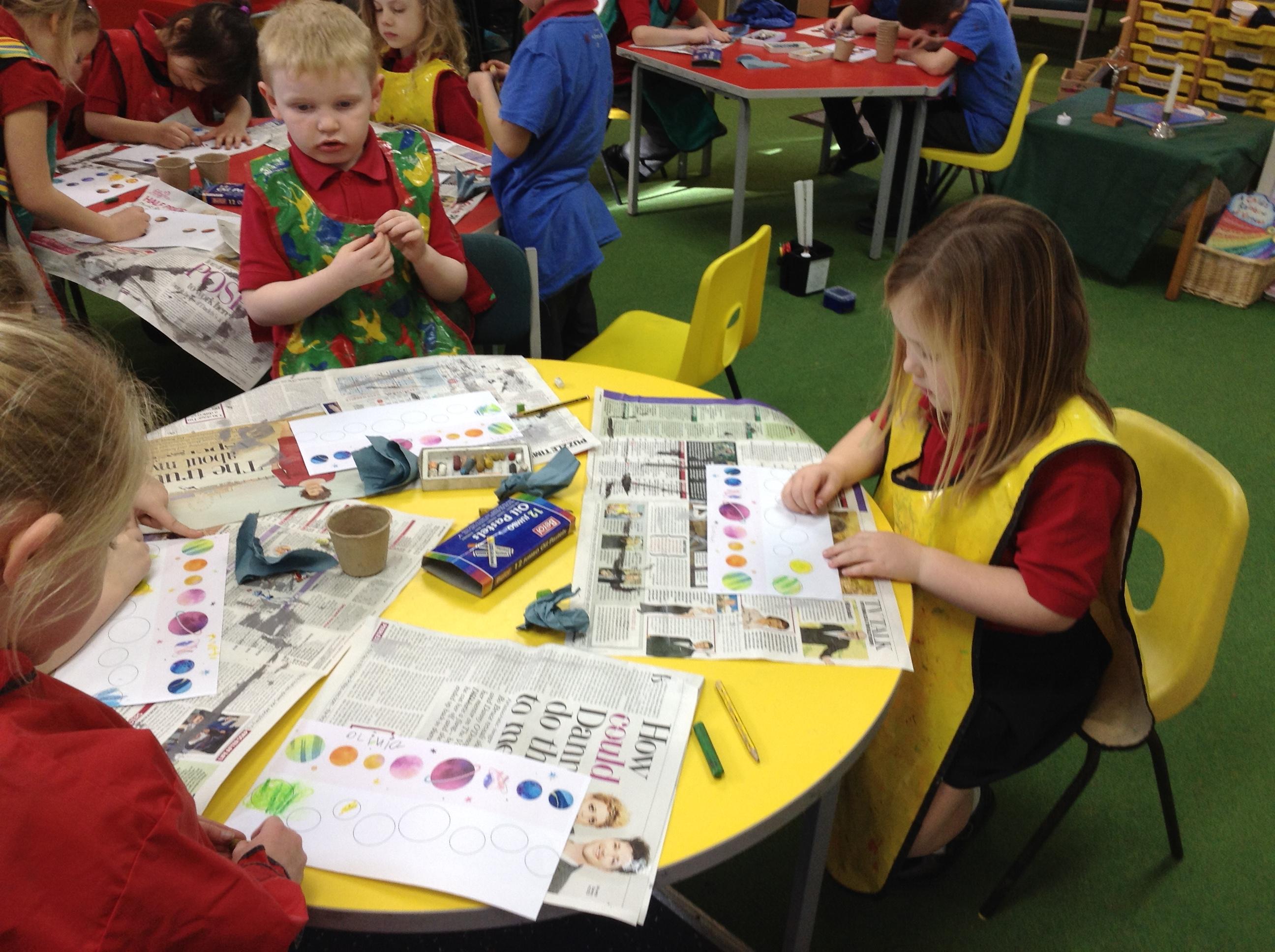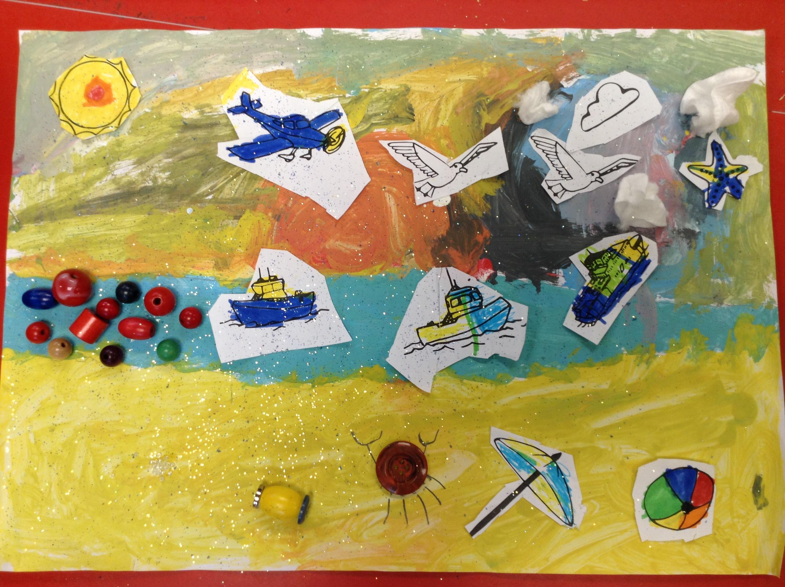 The children in Class 1 created wall displays ready for the corridor wall displays. Reception showed the difference between dark and light, Year 1 looked at sea and sky and finally Year 2 looked at land and sea.