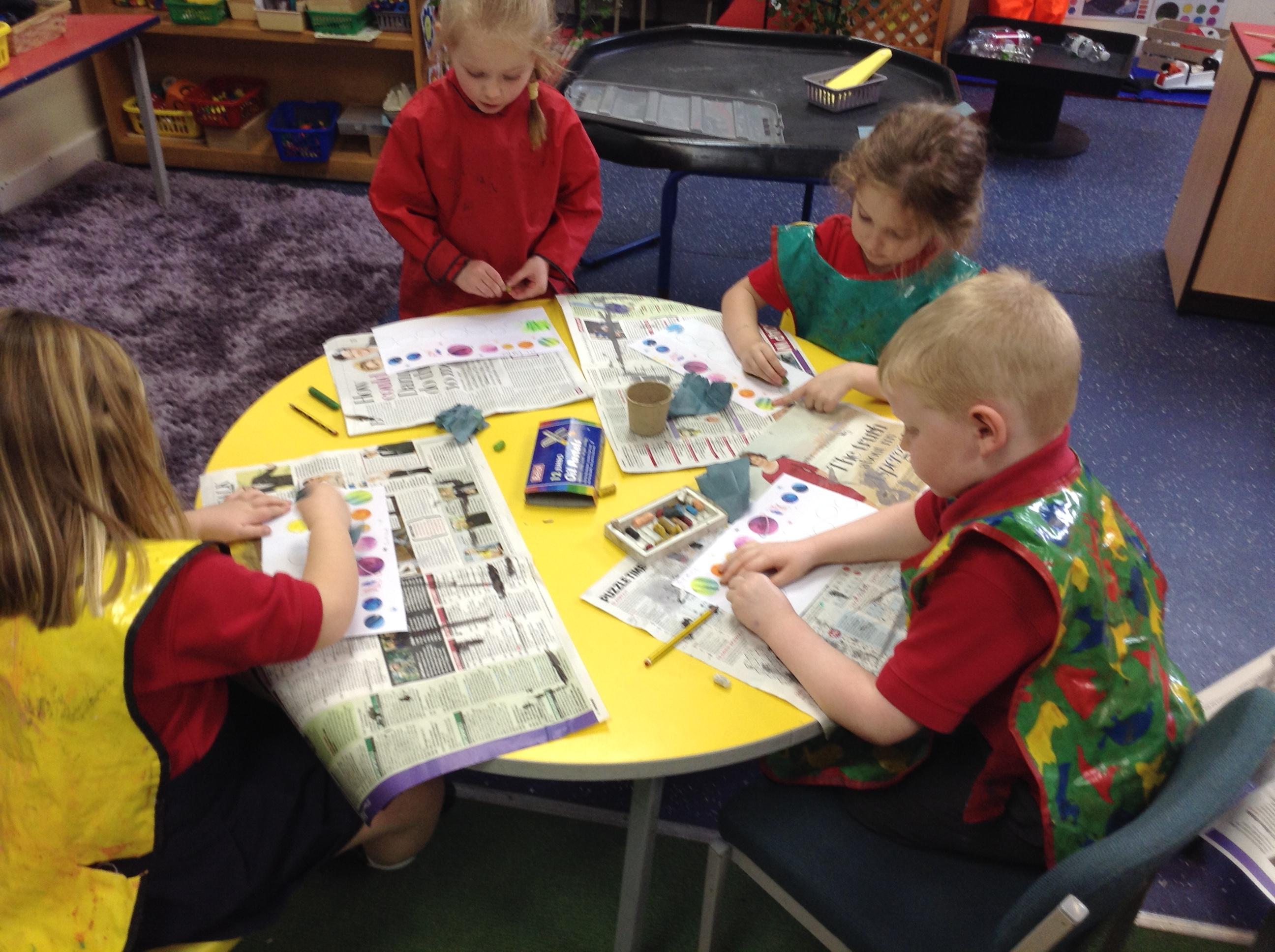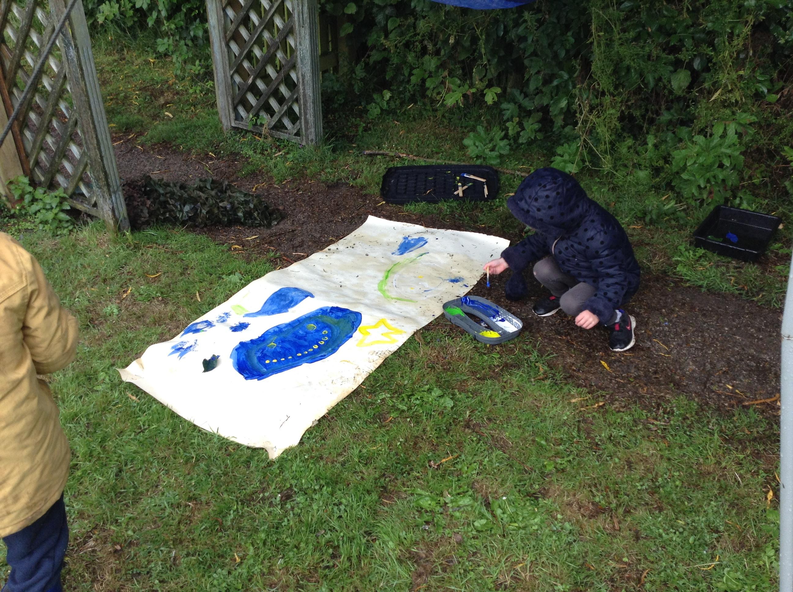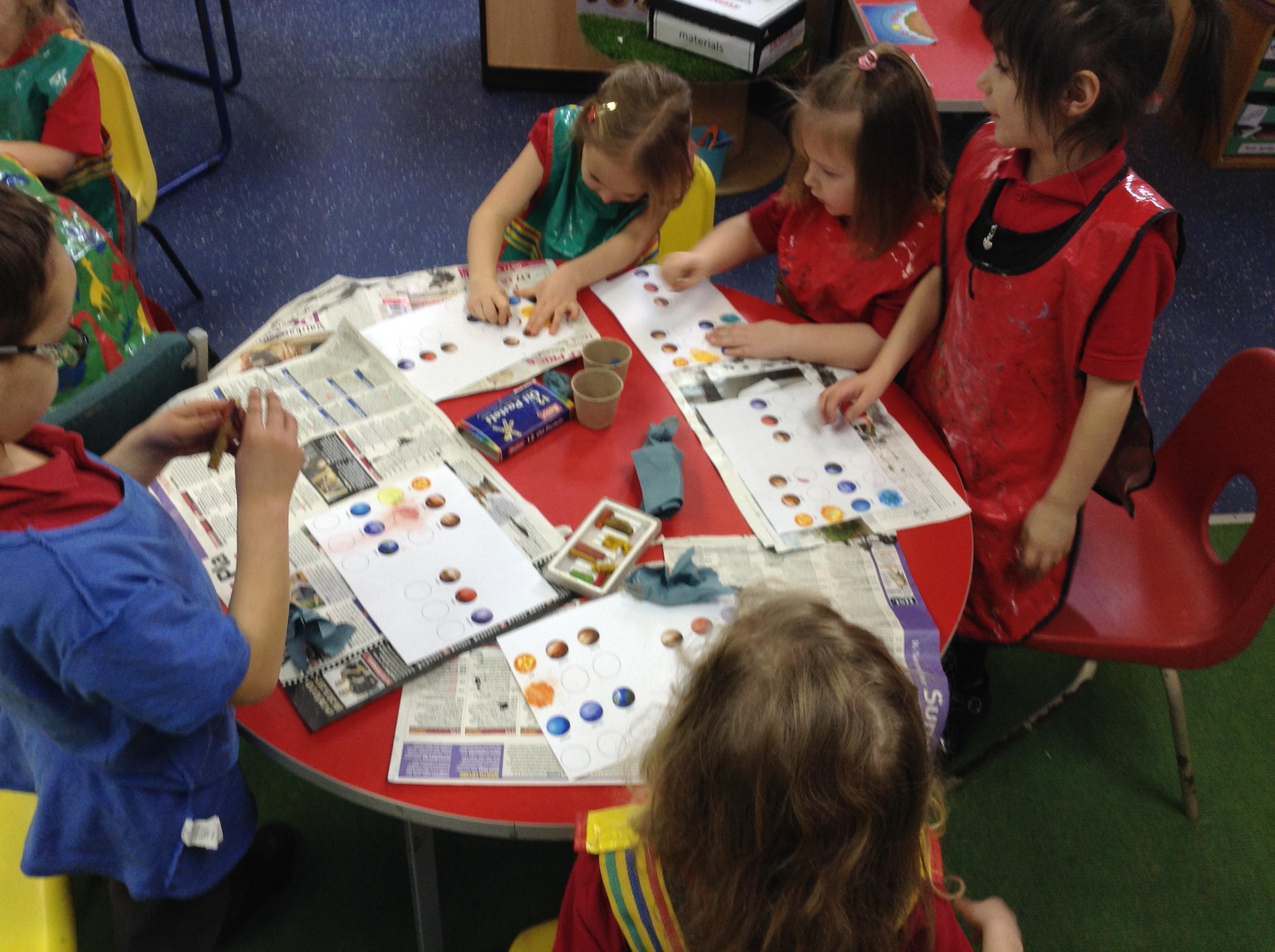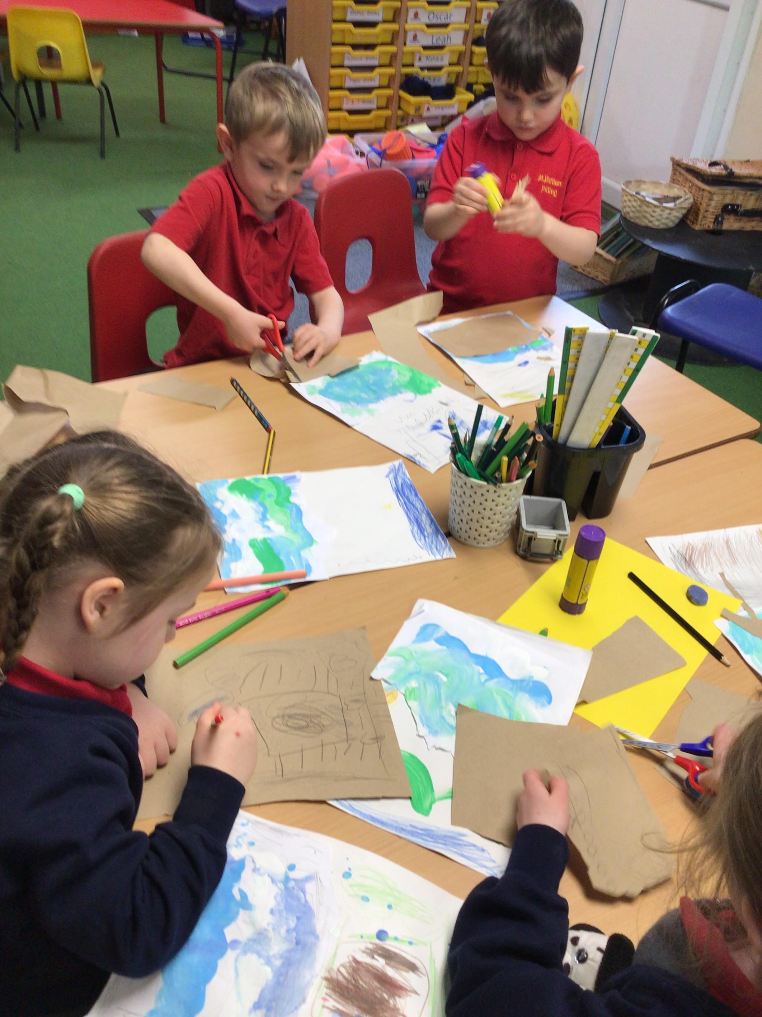 The children in Class 1 created wall displays ready for the corridor wall displays. Reception showed the difference between dark and light, Year 1 looked at sea and sky and finally Year 2 looked at land and sea.