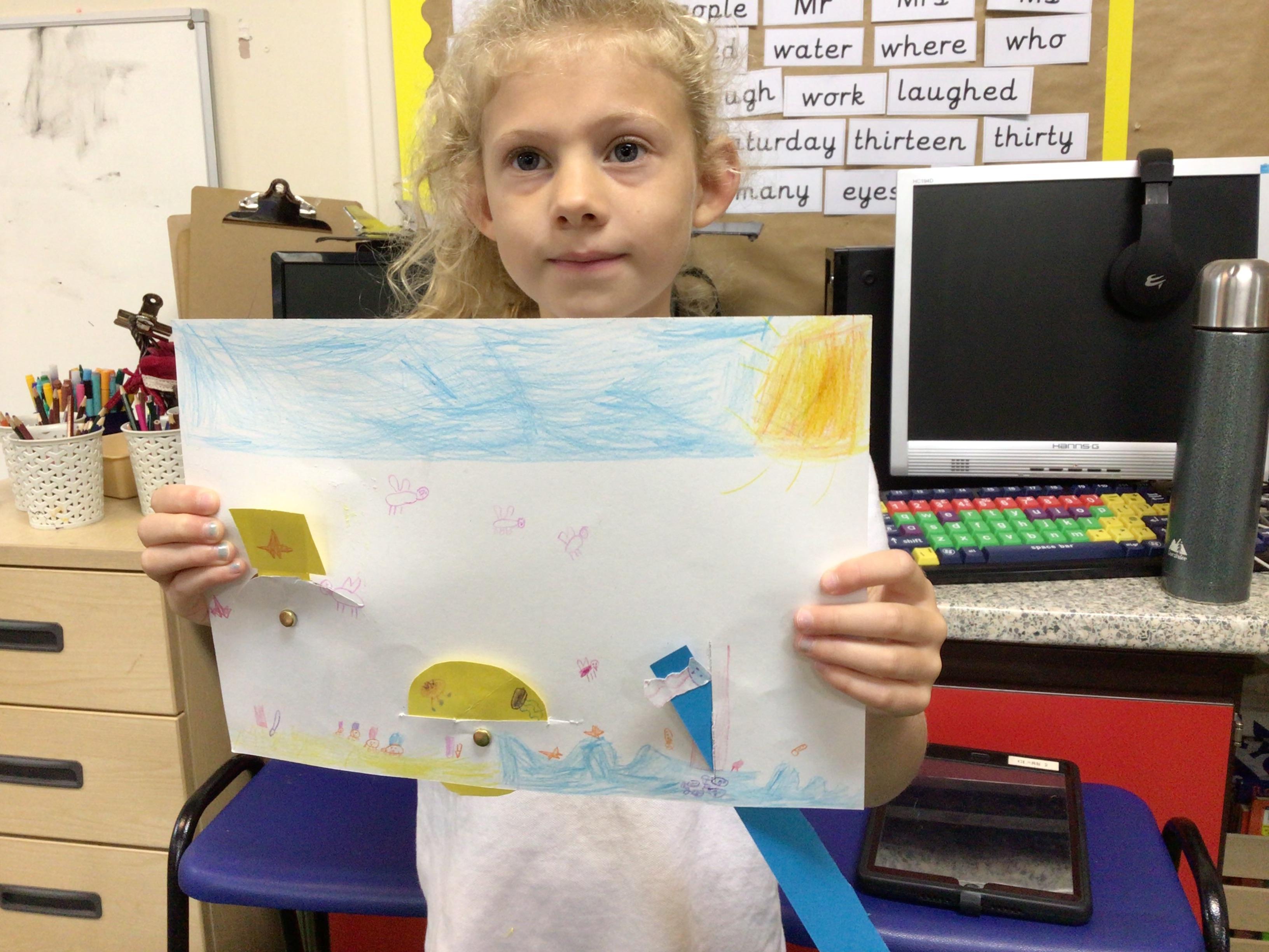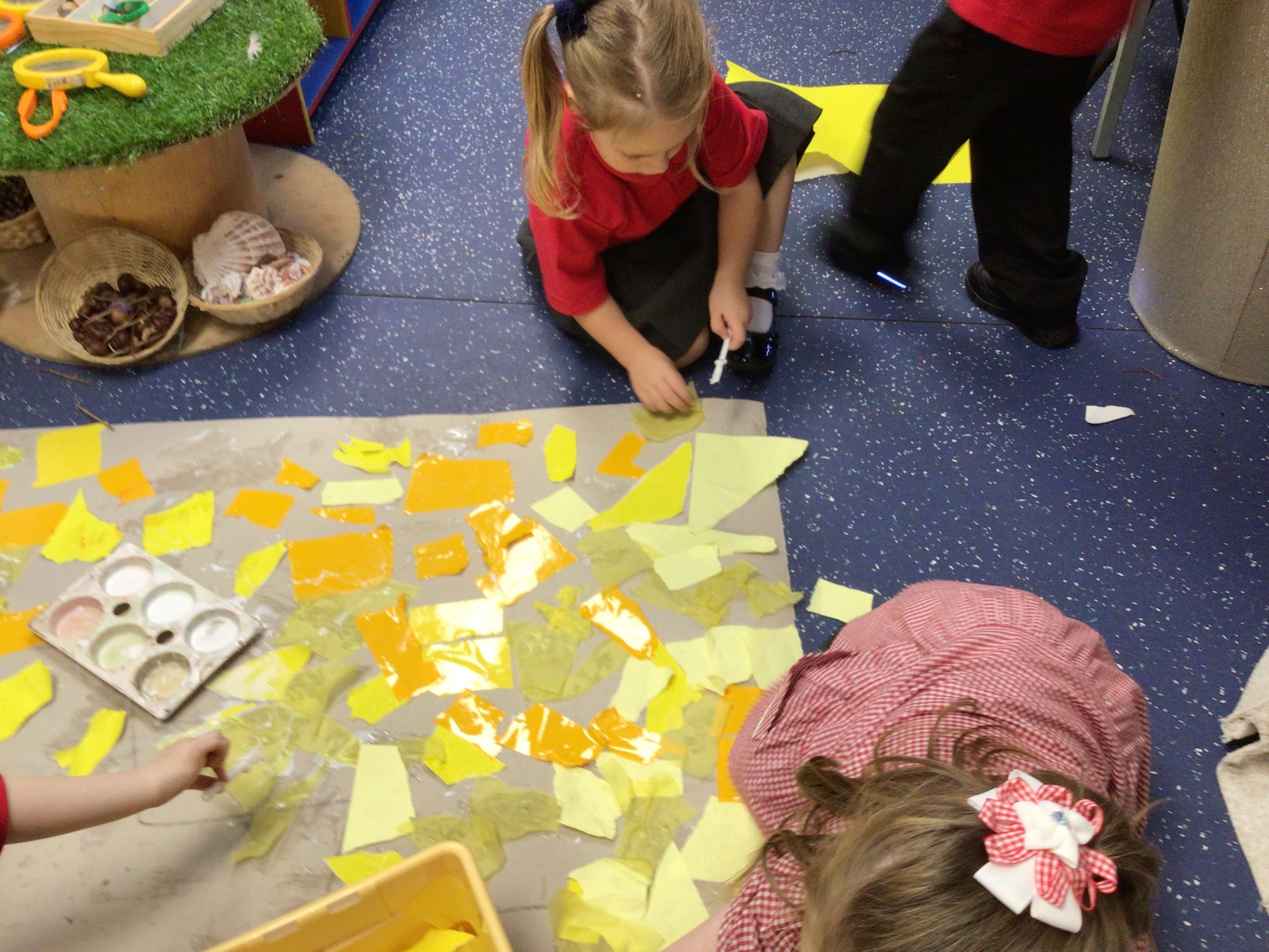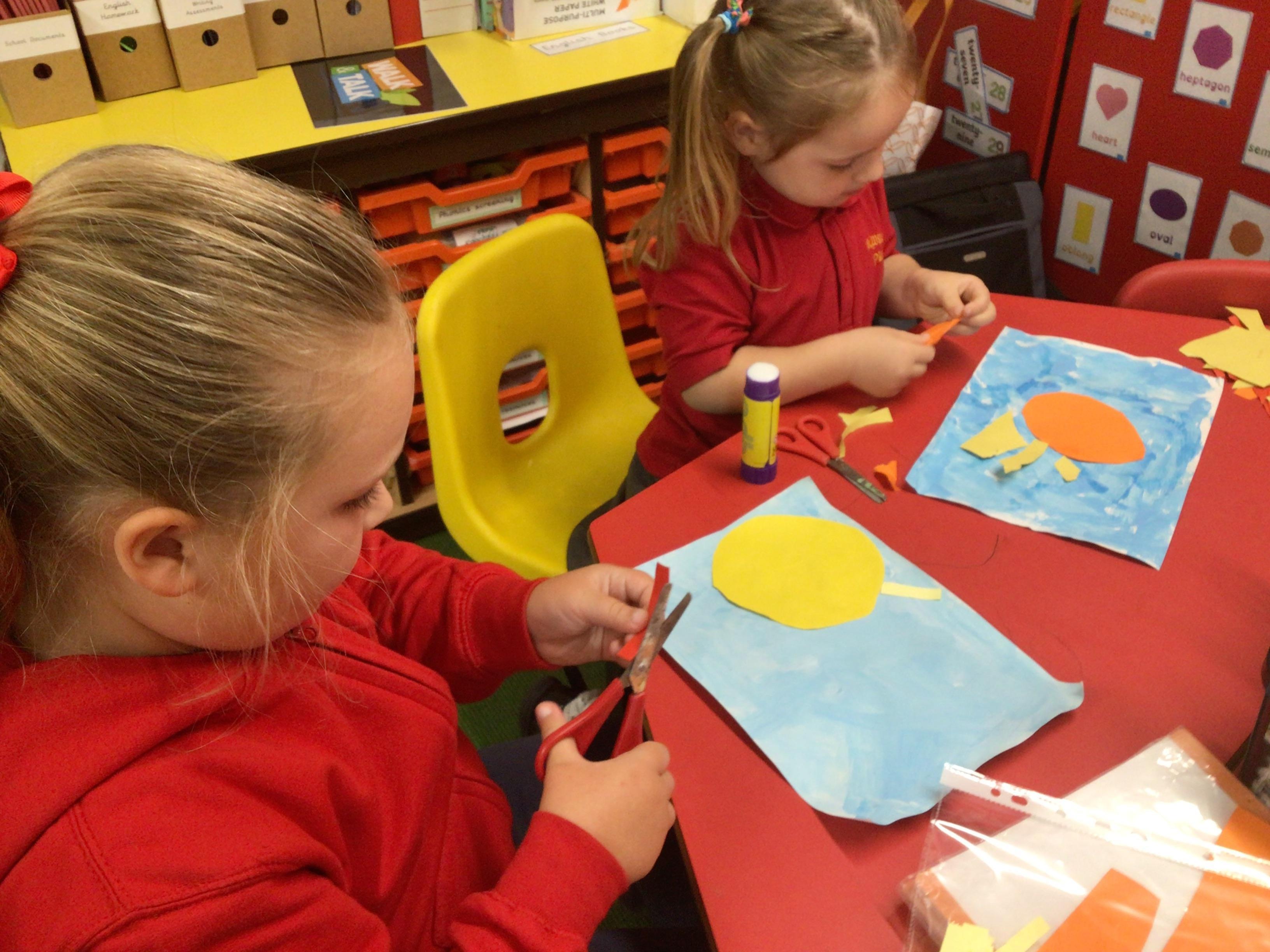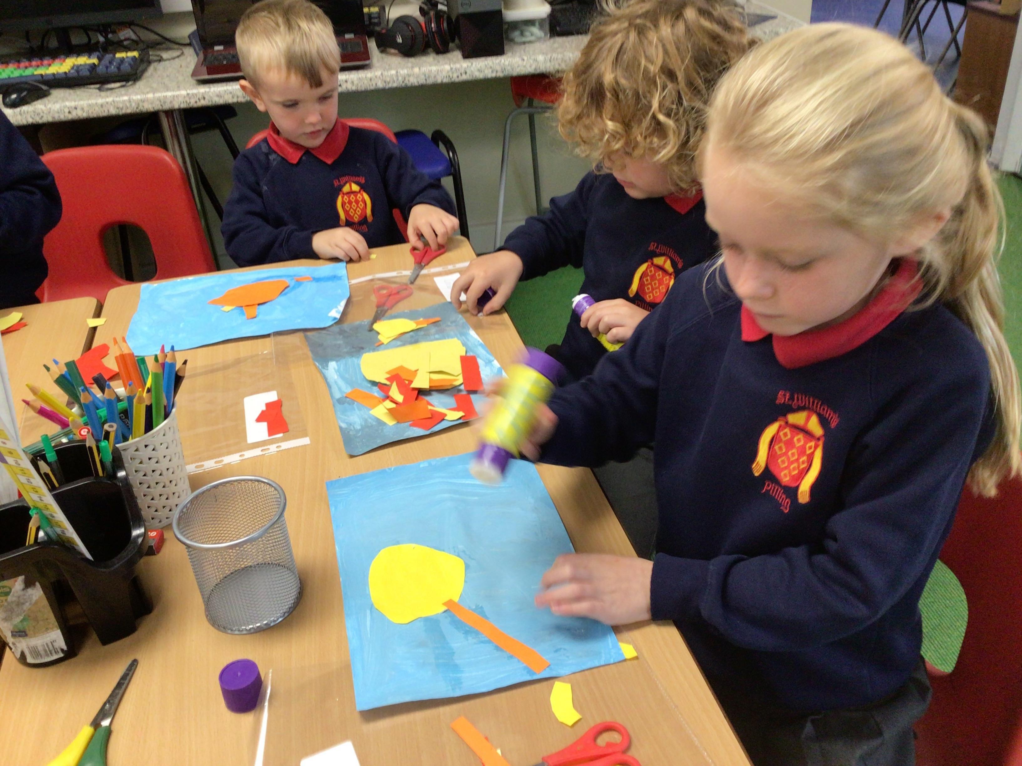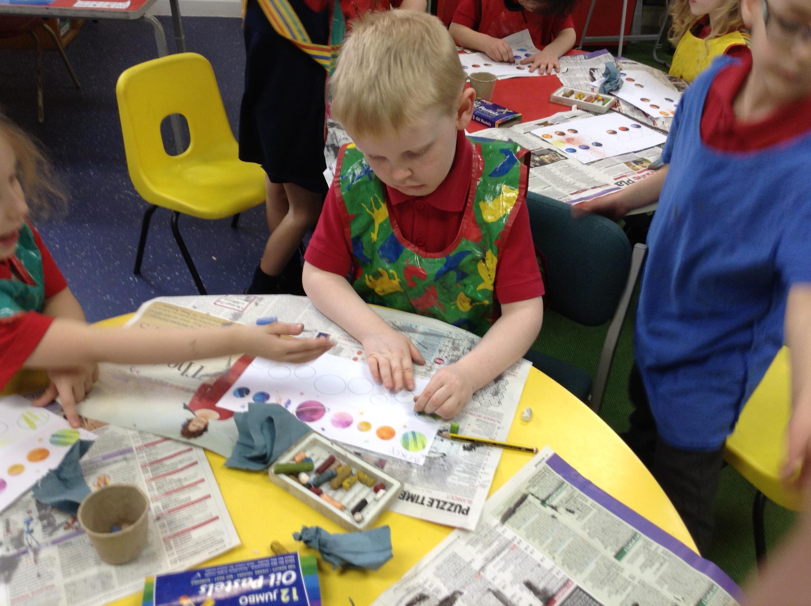 The children in Class 1 created wall displays ready for the corridor wall displays. Reception showed the difference between dark and light, Year 1 looked at sea and sky and finally Year 2 looked at land and sea.