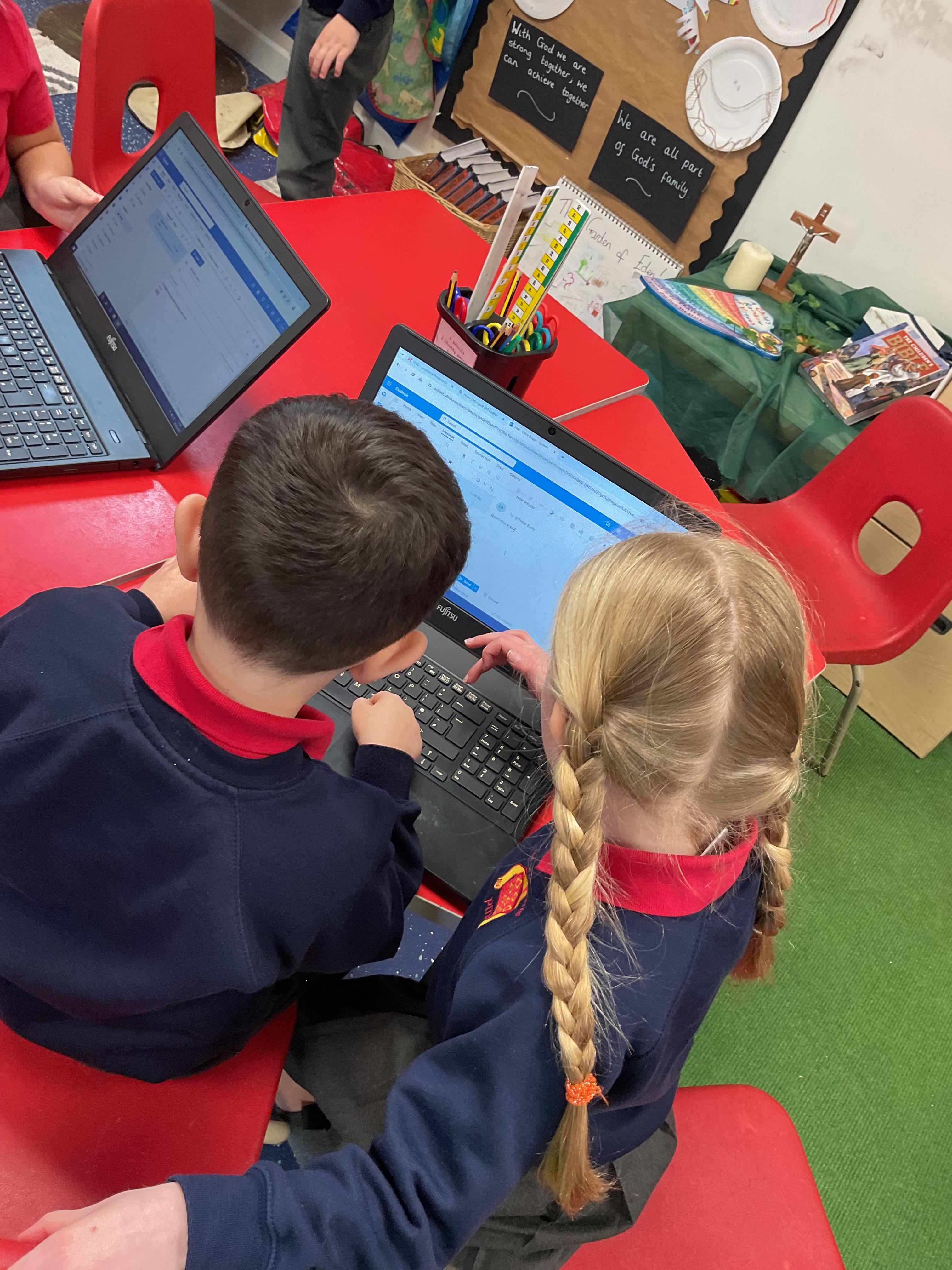The children in Year 1 & 2 have learnt how to email each other and have been fascinated to see how quick emails are delivered. They worked well in pairs to send emails to their friends.