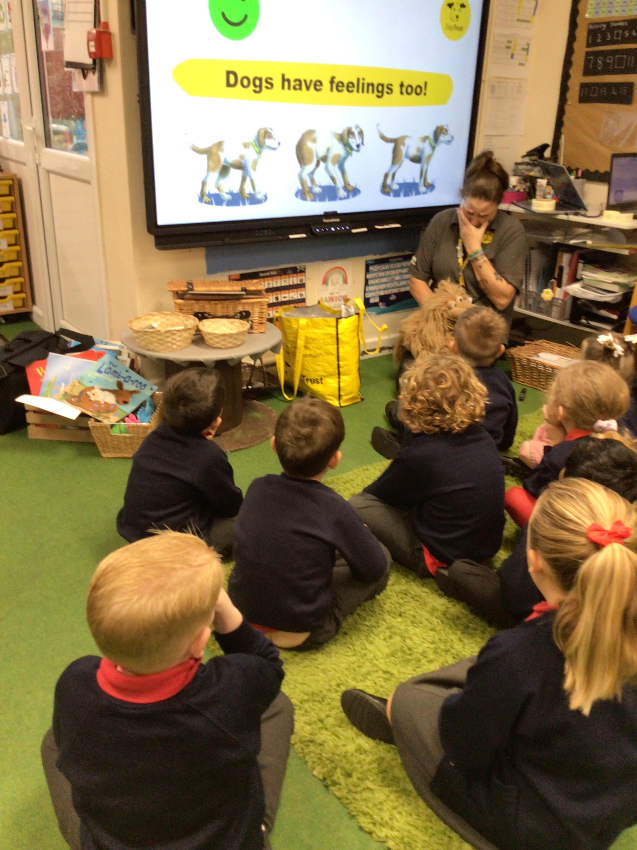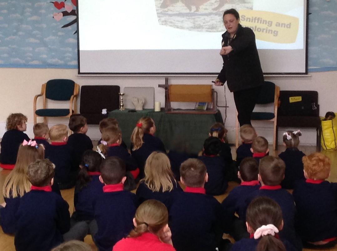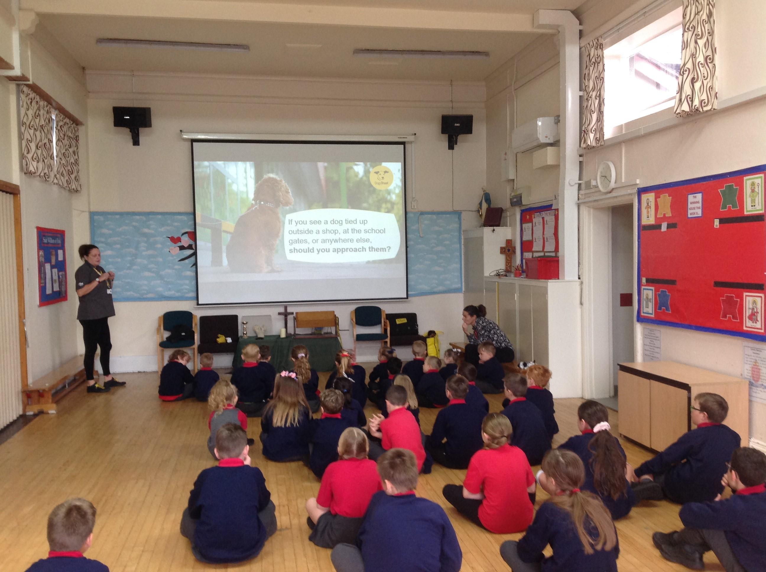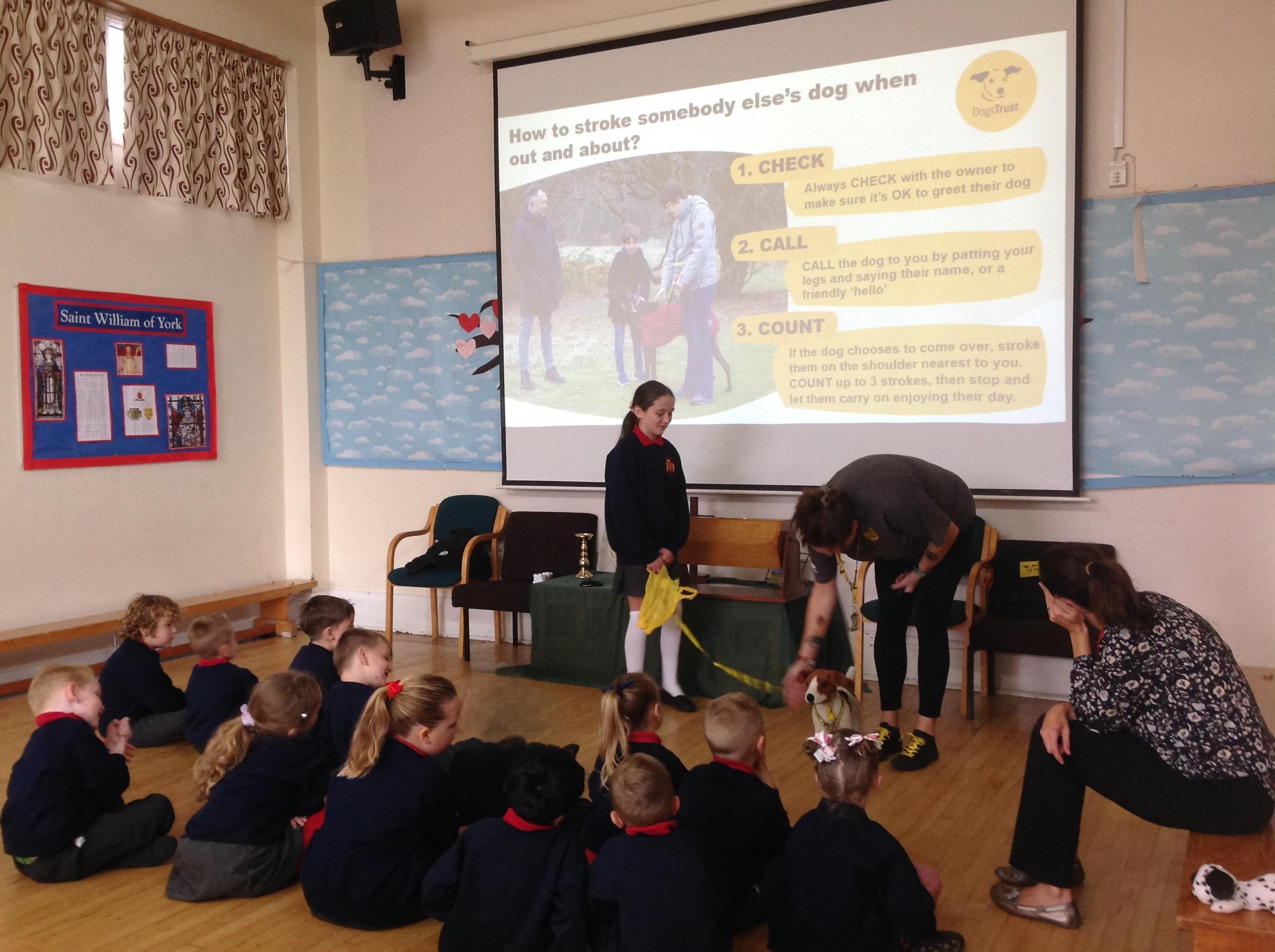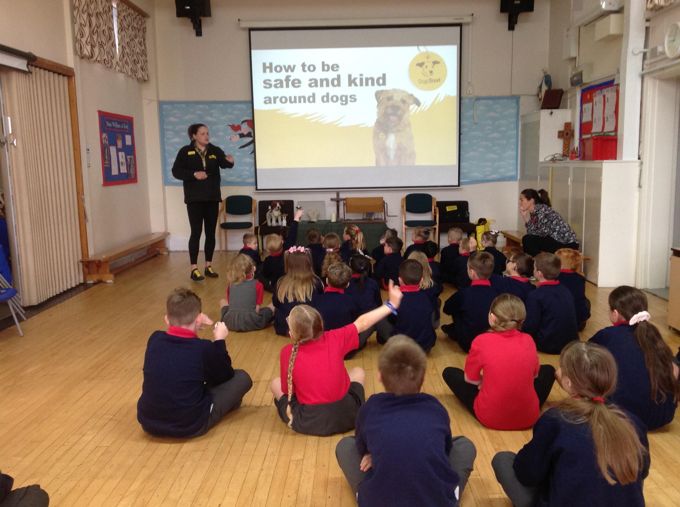 The children spent the morning learning about the ABCs of dog care (Affection, Busy, Choice) and to recognise how dogs use signals to communicate. The children started with an assembly in the hall before heading to their classrooms for workshops with their classmates.