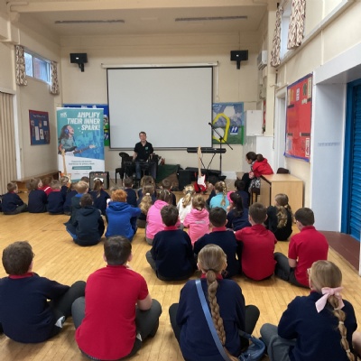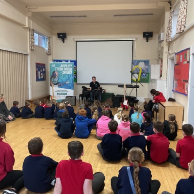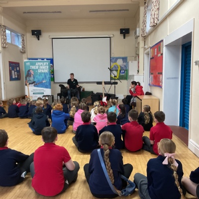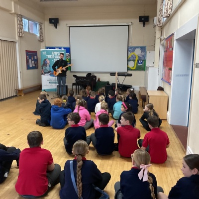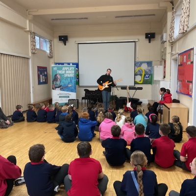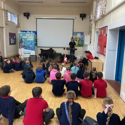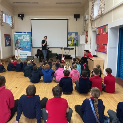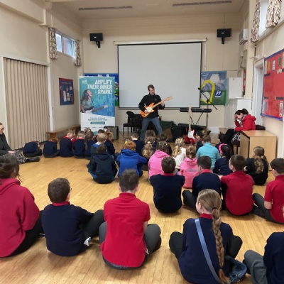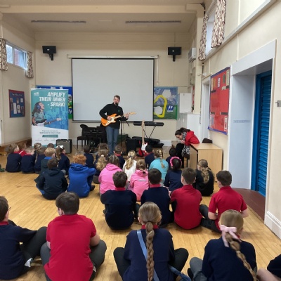 Today, Jacob led a Rockstar assembly showing us what we can expect when we start the lessons in school. It was so exciting! Mr Wood and Mrs Higginson did a great job showing us what it would be like to be in a band. We can't wait for the sessions to start after half-term.