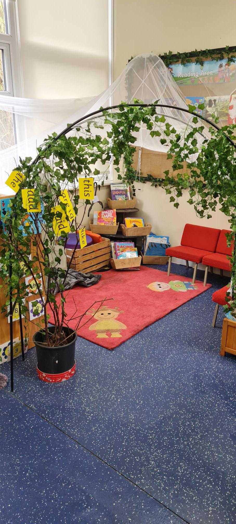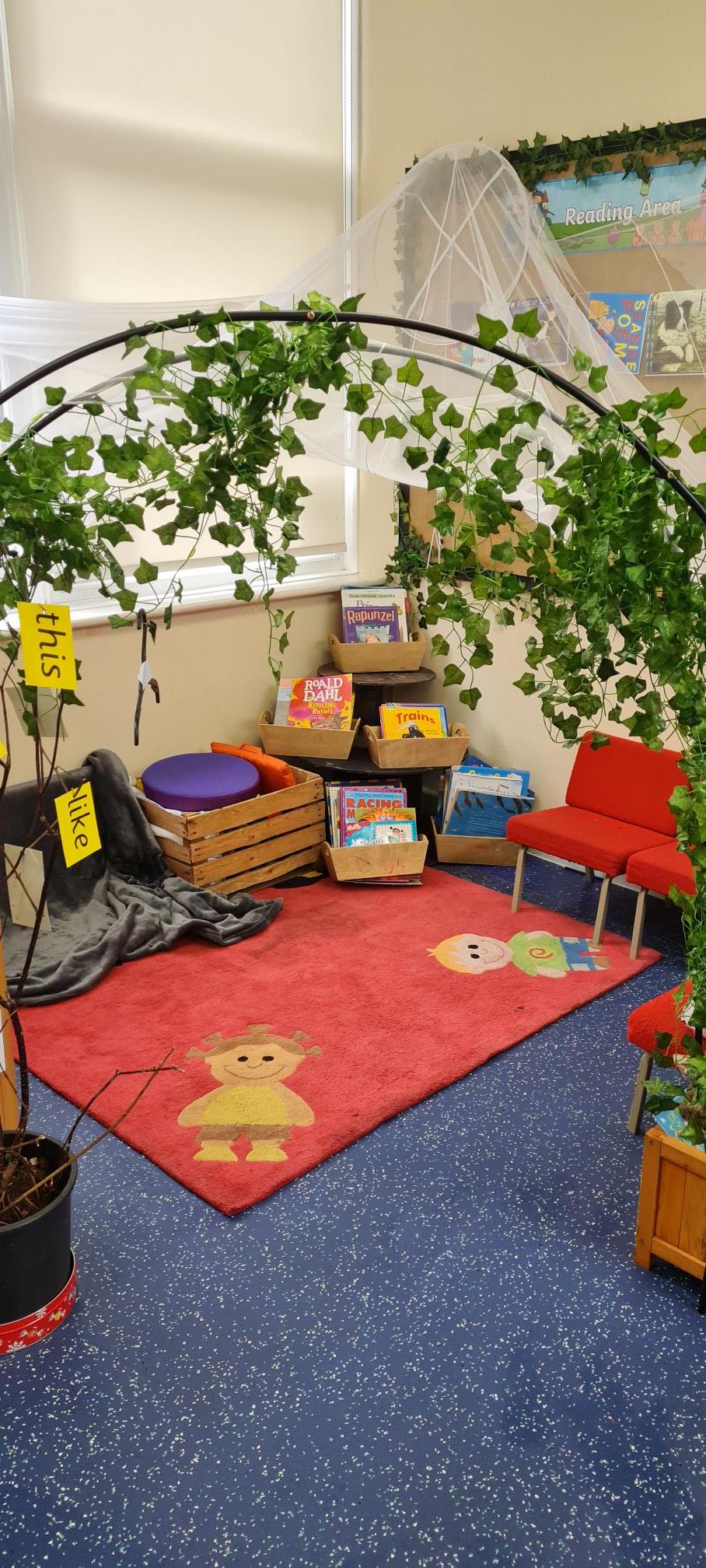 This is our reading corner. The children can access a range of different books including fiction, non fiction, poetry, reading books and traditional tales. The children like to make themselves cosy when they are reading with pillows, cushions and blankets.